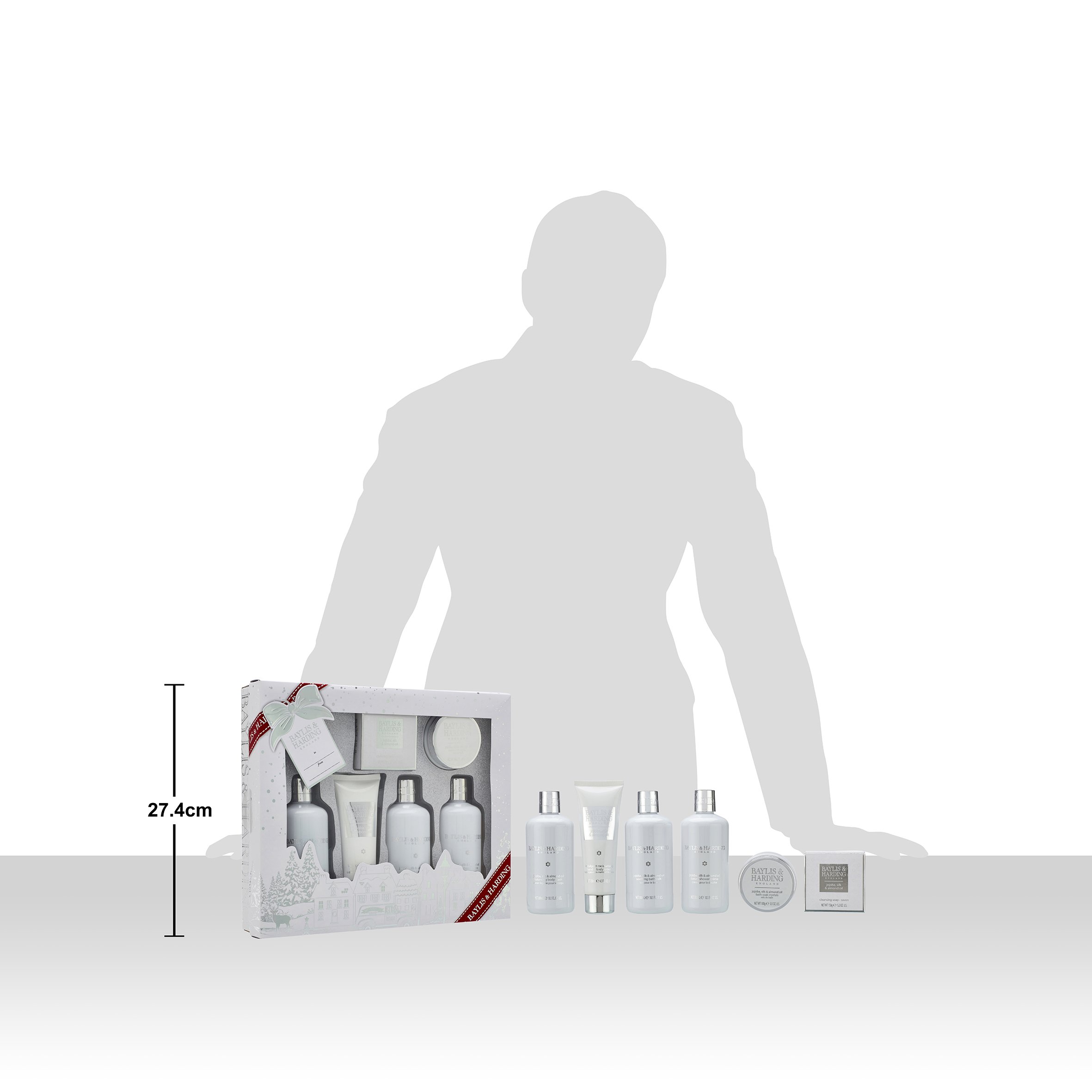 300 ml body wash, 300 ml Shower cream, 300 ml bath milk, 150 g boxed soap, 130 ml hand and body lotion and 100 g bath soak crystals