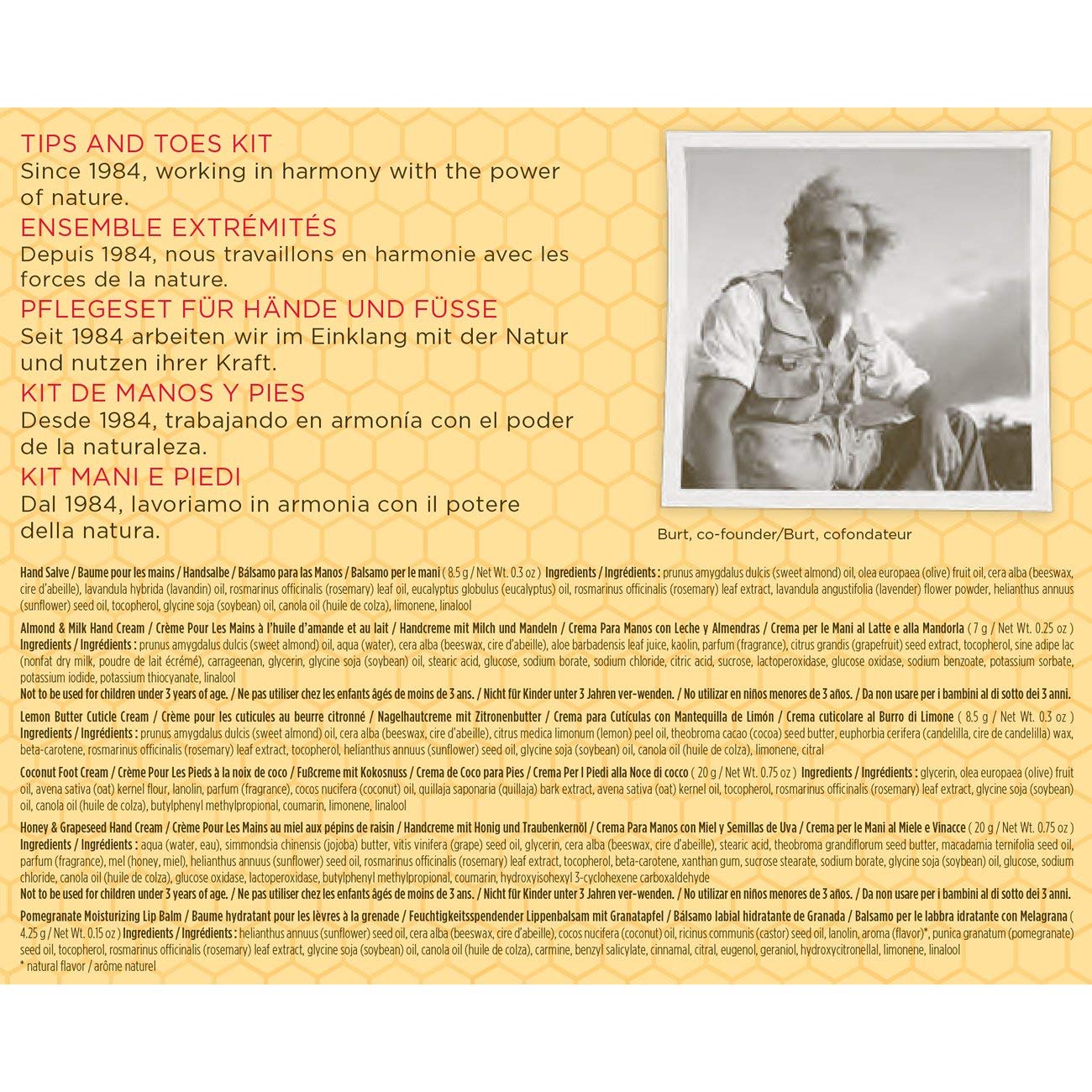 Includes 7g Almond Milk Beeswax Hand Cream,4.25g Lip Balm with Pomegranate Oil, 20g Honey and Grapeseed Oil Hand Cream, 20g Coconut Foot Cream, 8.5g Hand Salve and 8.5g Lemon Butter Cuticle Cream