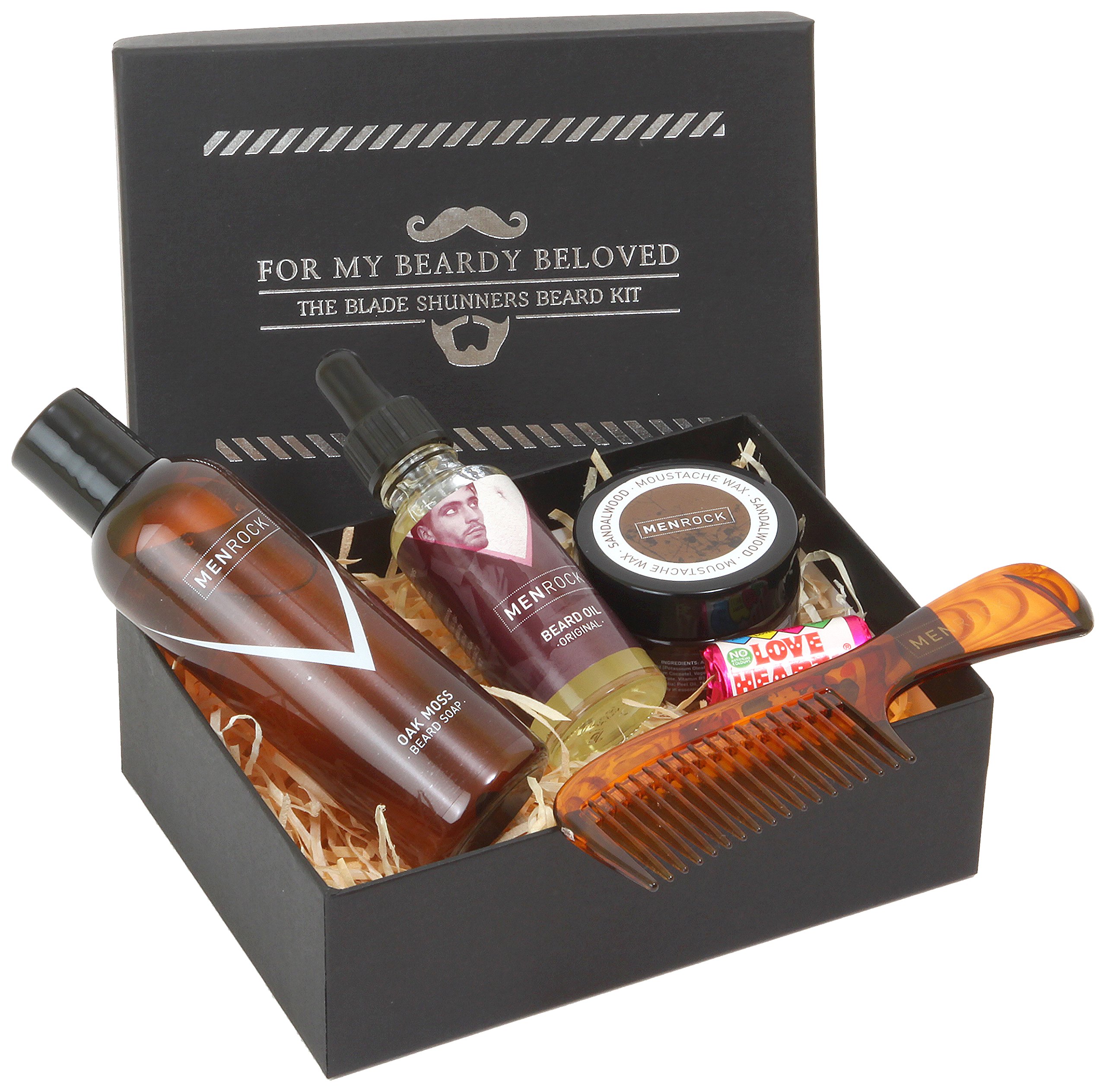 Contains a beard wash, beard oil, styling wax & Men Rock branded beard and mustache comb