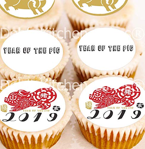 Chinese New Year 2019 Cake Toppers - PRE-CUT - Year of the Pig Cupcake Toppers - Edible Wafer - 4cm x 24
