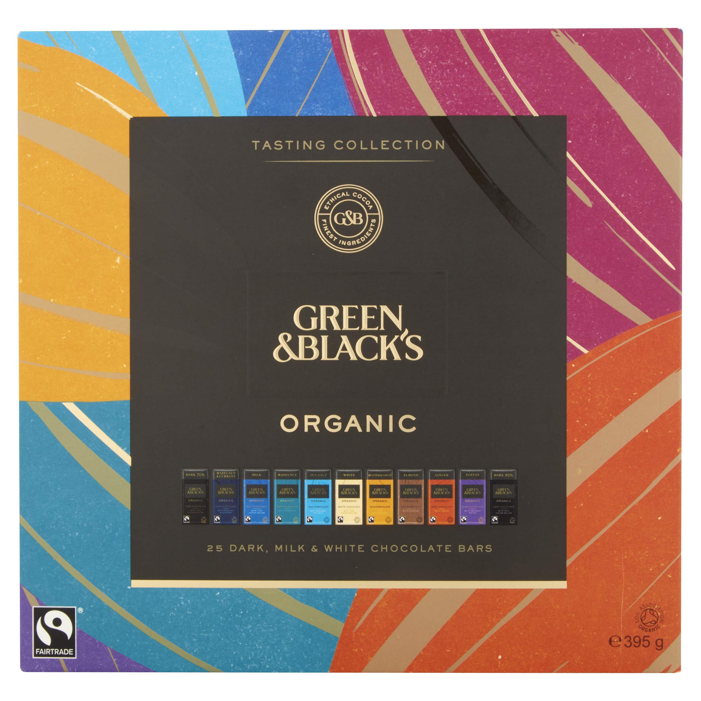 Explore a world of flavour with Green& Black’s Organic. 395g Green && Black’s Organic Tasting Collection. 24 Miniature Bars of Milk, Dark & White Chocolate with a small Dark 70%
