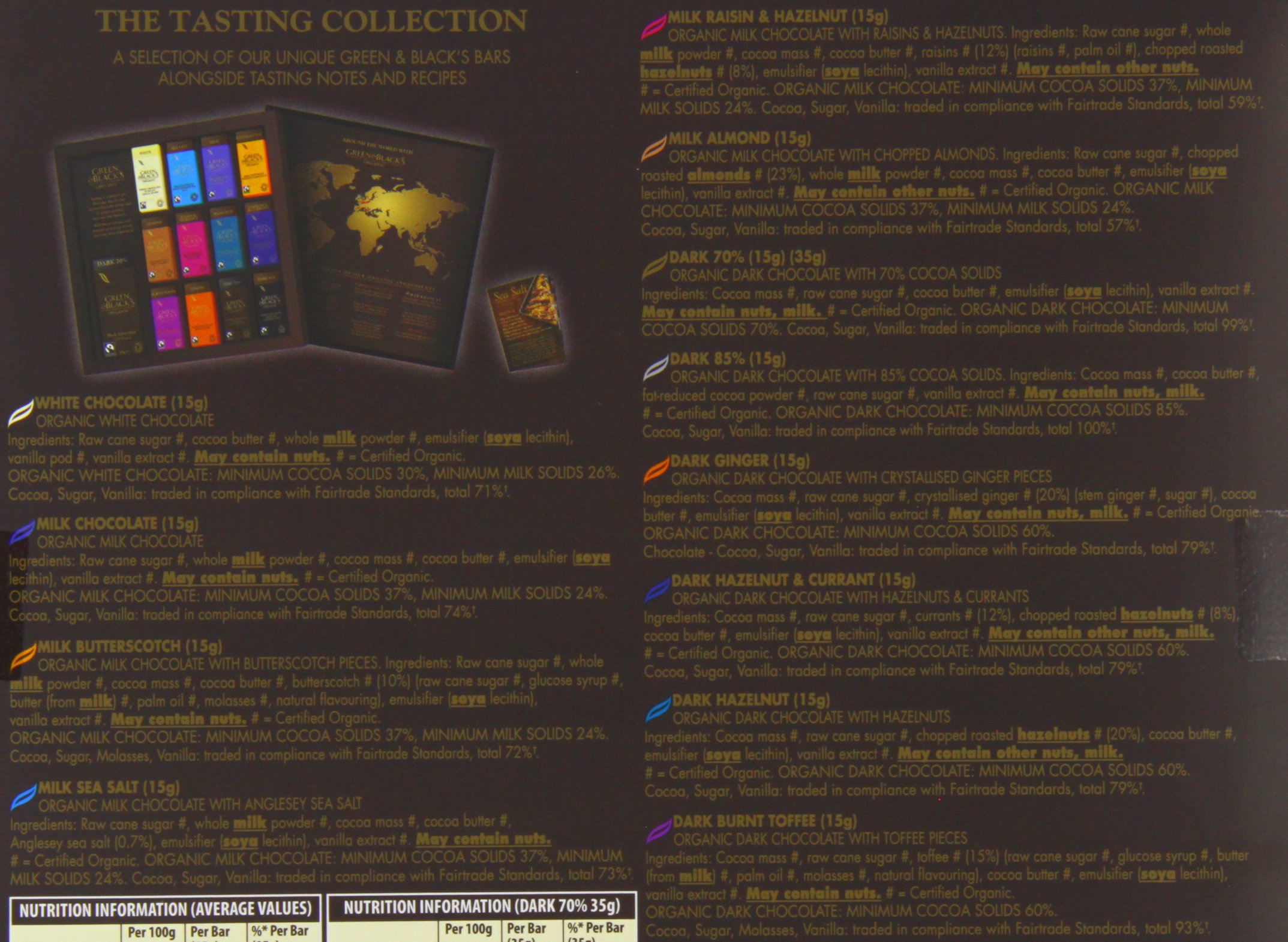 Explore a world of flavour with Green& Black’s Organic. 395g Green && Black’s Organic Tasting Collection. 24 Miniature Bars of Milk, Dark & White Chocolate with a small Dark 70% Chocolate Bar and Tasting Notes. A tasting journey world wide to find the intense and refined flavours of Green & Black’s. Similar to wine, chocolate has a great complexity and depth of flavour. From the velvety sweet and fragrant white chocolate recipe to our smooth and intense dark 85% chocolate. The Tasting Collection takes everyone on a journey of taste. You’re going to discover 12 unique flavours with accompanying tasting notes and recipes, every one providing a in point of fact inspiring experience.