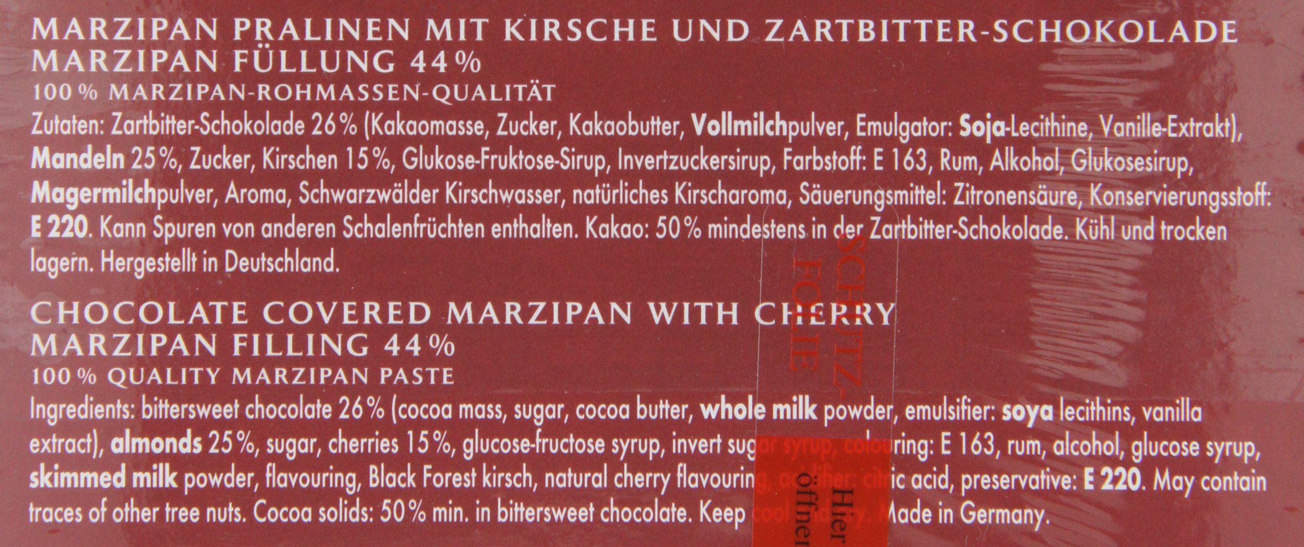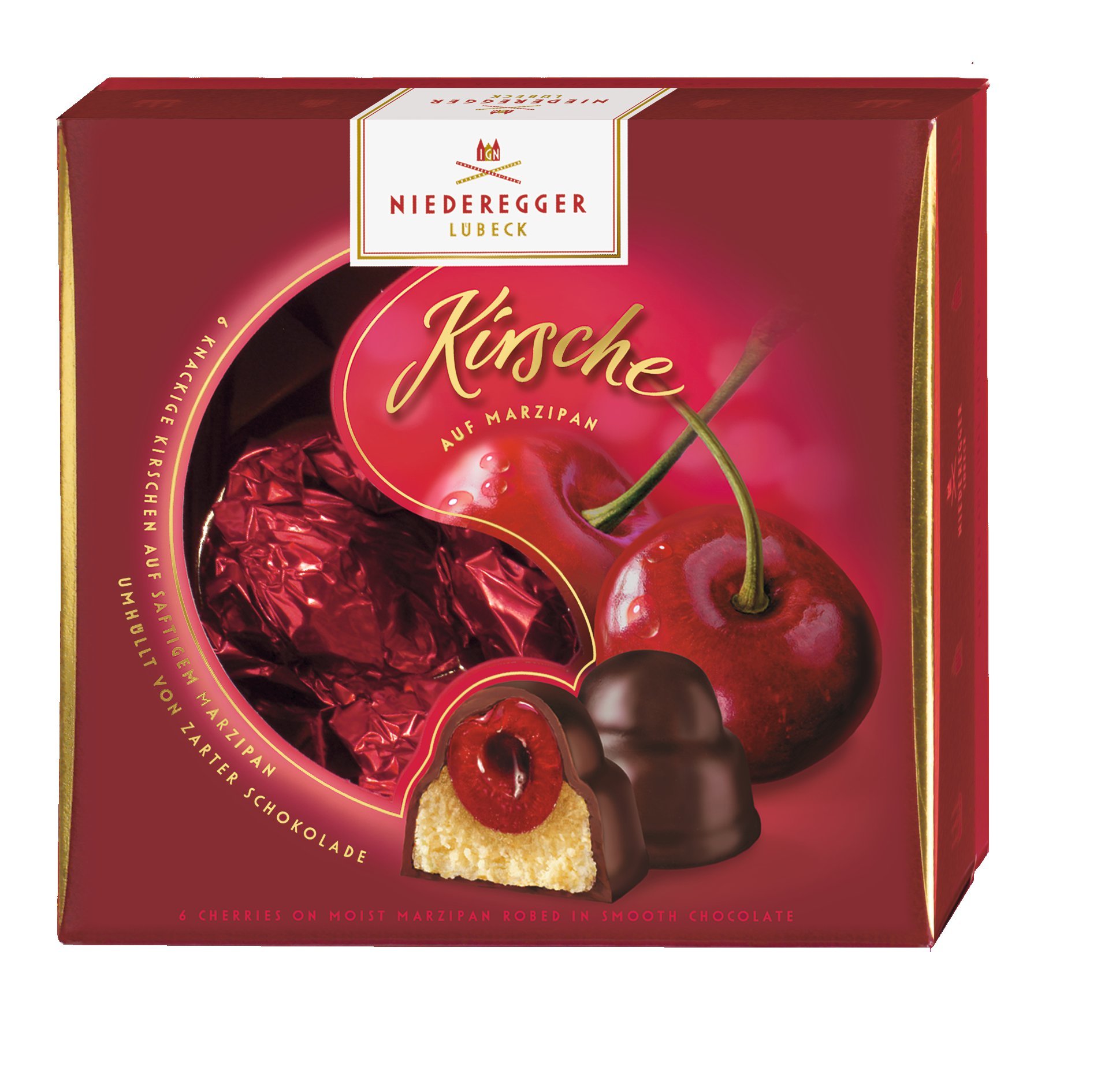 Succulent moist Niederegger marzipan topped with a kirsch-soaked cherry and smothered in thick bittersweet chocolate (dark chocolate with a little milk chocolate added). These individually wrapped Niederegger Marzipans with Kirsch Cherry may be a blast from the Black Forest gateau past but they’re sooo delicious you’ll be able to be reluctant to share.