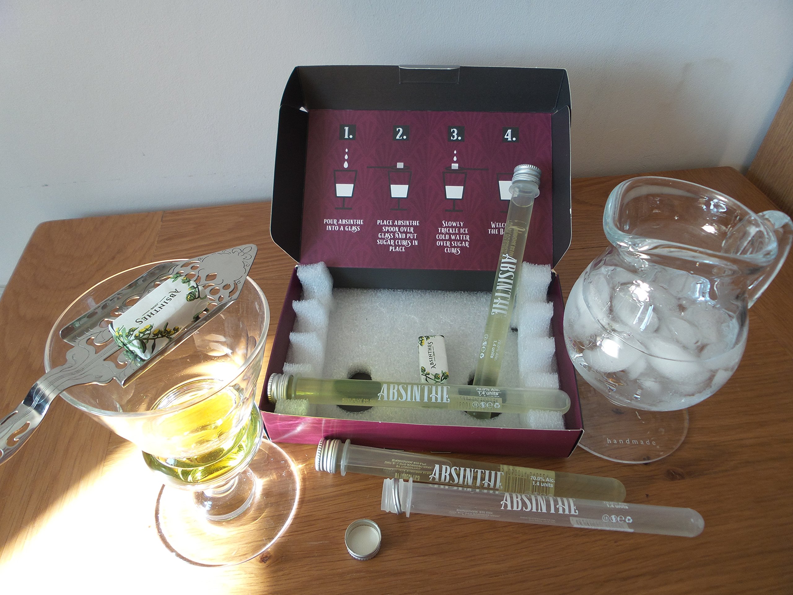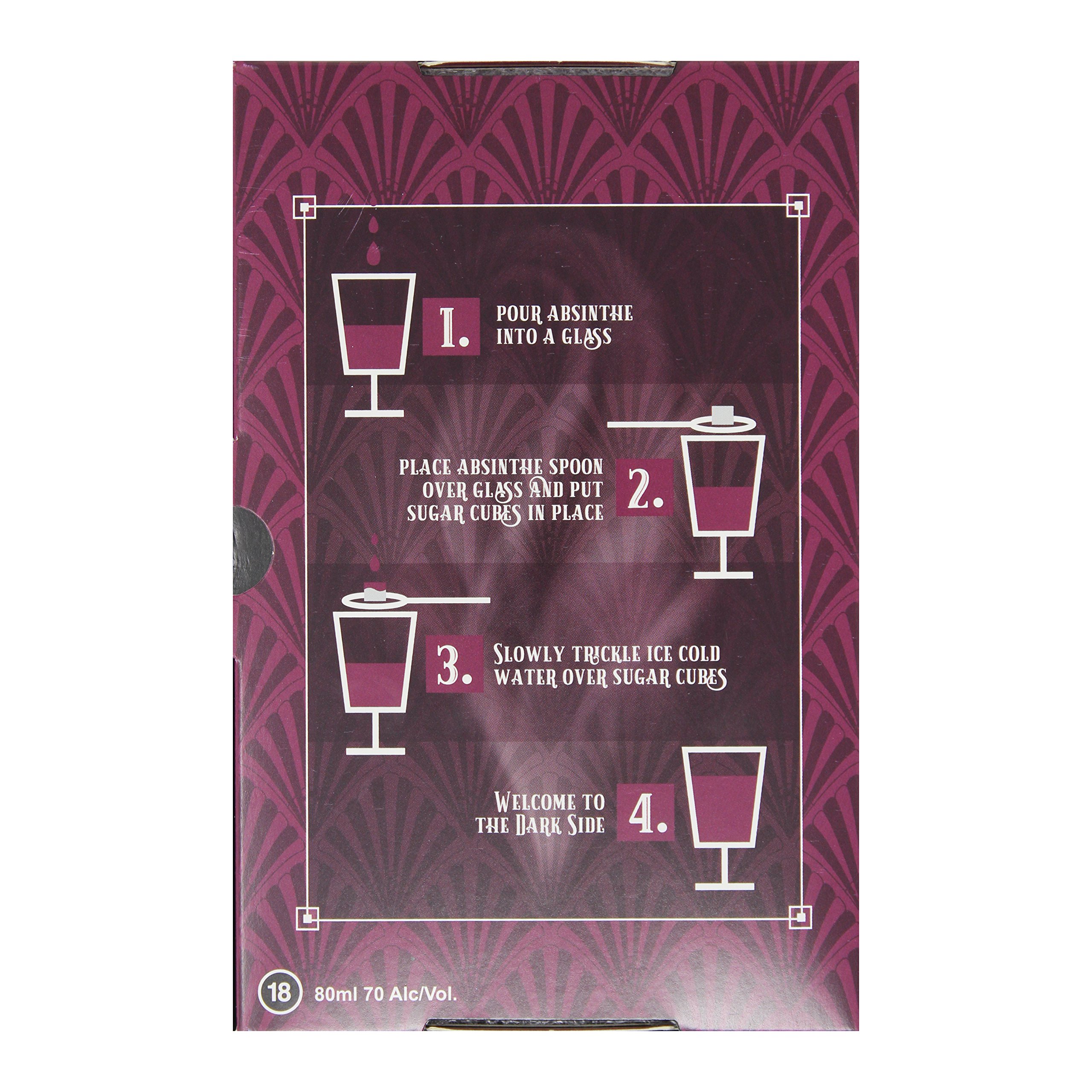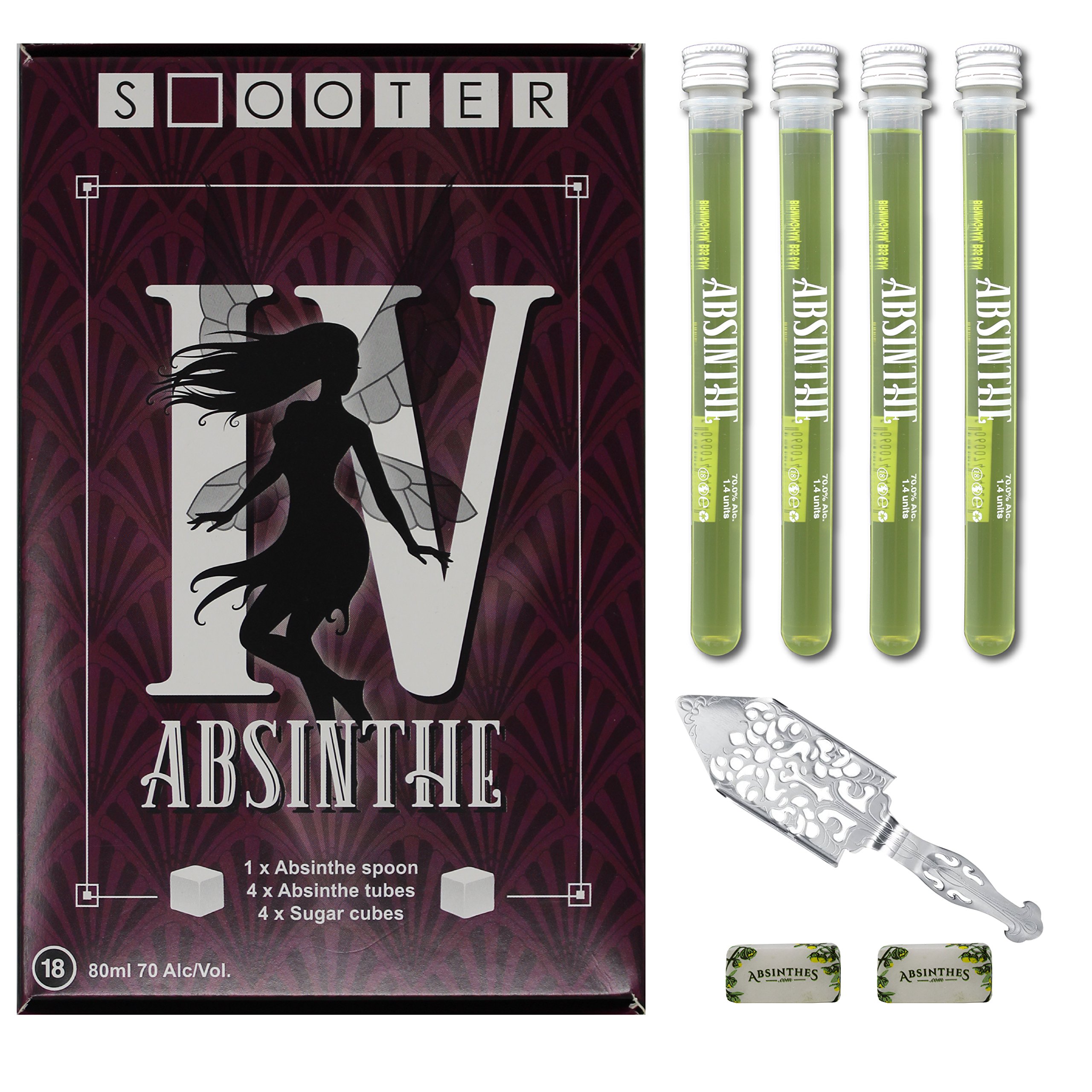 This whole “Green Fairy” box set has the whole lot you wish to have. It includes 4 Absinthe 70% ABV miniatures. 4 Absinthe Sugars. 1 Ornate Absinthe spoon plus instructions.