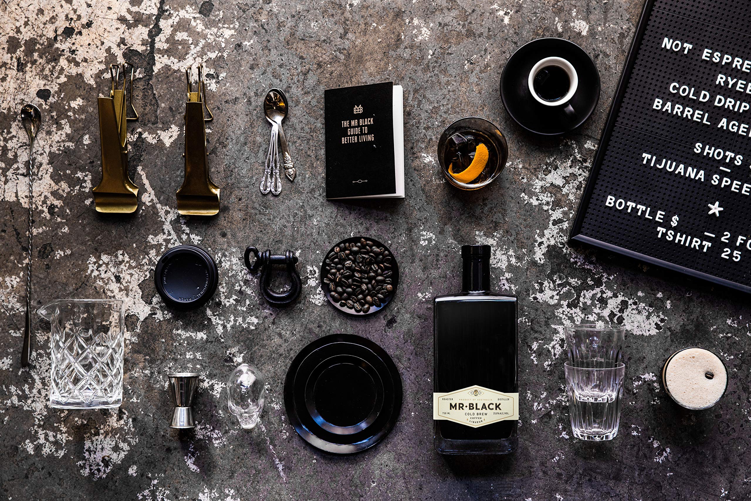 The dark side of coffee.Mr. Black is the original cold press coffee liqueur – a bitter, intense spirit and coffee creation not intended for the weak of mind or faint of heart. A unique drop that embodies Australia’s progressive coffee culture and our unrelenting pursuit of steel ground, cold extracted, caffeinated perfection.Bitter, bold, and impeccably balanced, Mr. Black is not everyone’s cup of tea. If truth be told, if you are after a cup of tea,you’re in the fallacious place entirely. Mr. Black is dark blend of pure Australian grain spirit and three specialty coffees from three unique origins, chosen for their aroma, flavour and finish.It took 9 months and over 240 trials to create Mr. Black, a devilishly dark liquor with a bold coffee kick. This exceptional spirit is ground and cold-pressed by hand in tiny batches of 300 at our very small distillery at the Central Coast of New South Wales.Single origin arabica beans are sourced from Papua New Guinea, Ethiopia, and Brazil. Each and every bean is roasted to exact specifications to make sure correct caramelisation and flavour profile.Mr. Black is cold infused, cold pressed and unfiltered to make sure the flavours and aromas reflect the character and provenance of the coffee beans.Colour: Black.Aroma: Overwhelming fresh espresso.Body: Bitter yet balanced, Chocolate and caramel. Fine citrus edge.Finish: Toffee. Marmalade. Coffee ’til the end.Call to mind Mr Black as cocktail-ketchup for dark spirits and stirred cocktails. It makes a lot of classic cocktails better; think a Negroni made with Mr Black; a Black Old Fashioned or blend Mr Black 50:50 with whisky, mezcal, tequila or rum for a small demonstration of what coffee can bring to mixed drinks.