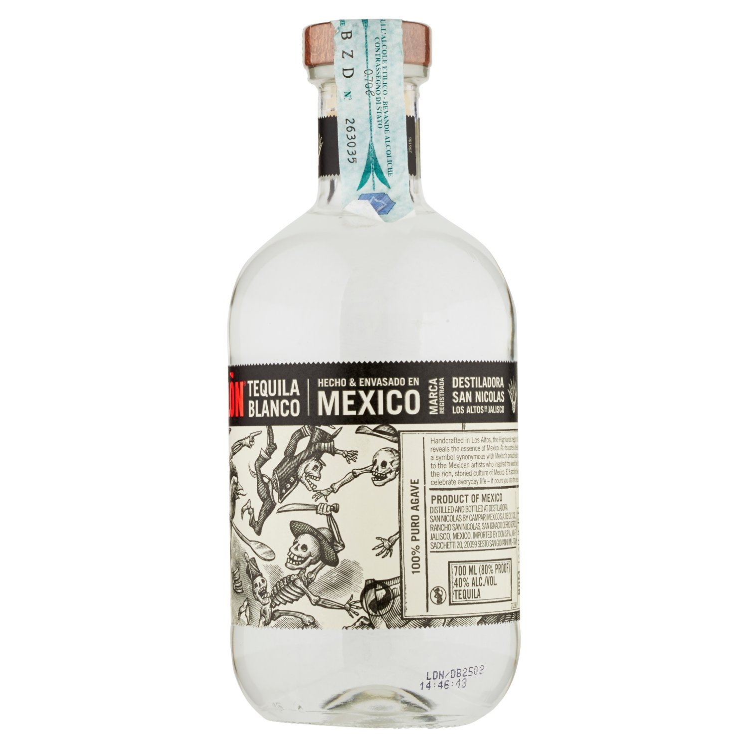 Espolon Tequila is made in Los Altos, the Highland region of Jalisco, Mexico thought to be probably the most highest for Tequila. This blanco without a oak aging has a clean nose of sweet Agave, floral notes with a citrus edge and a touch of spicy pepper. The palate has a phenomenal soft mouth feel, with vanilla, pepper and baked agave. Chic, clean with a spicy finish. The label depicts Mexico’s obsession with the dead and skeletons, riding a rooster!