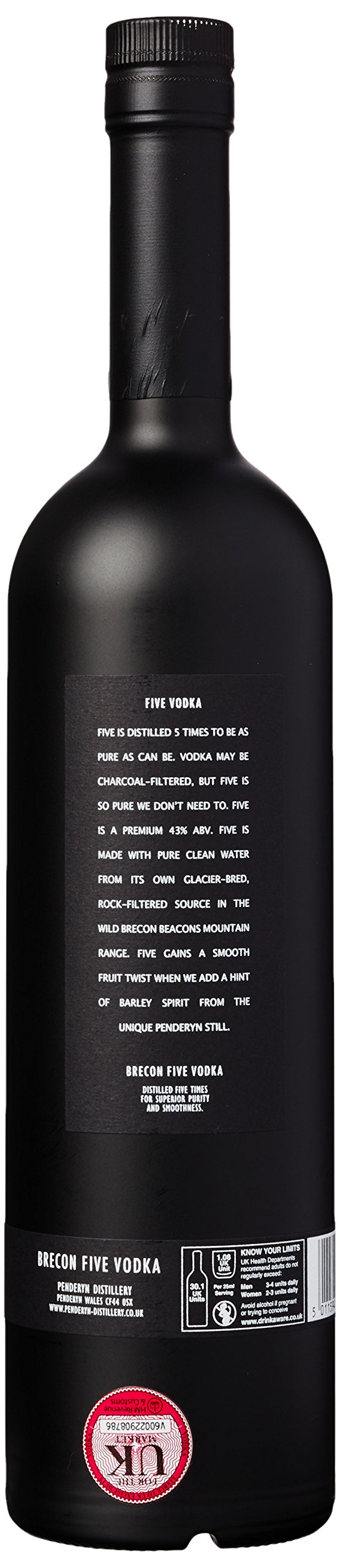 Brecon Five Vodka is five times distilled for superior purity and smoothness. Brecon Five Vodka features a high quality cut of the Penderyn spirit and water from the pretty Brecon Beacons National Park.