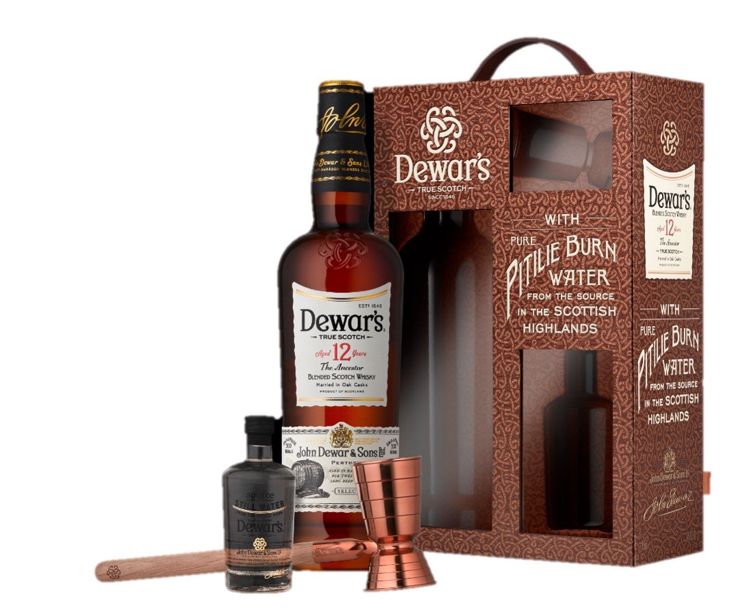 Bespoke gift pack contains, one bottle Dewar’s 70 cl plus one water bottle of the Pitilie Burn 95 ml plus one jigger 60/20 m