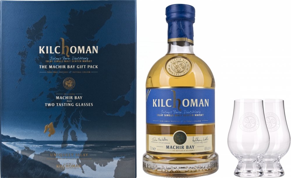 “70cl / 46.0% – A present pack from the Kilchoman distillery at the west coast of Islay. This pack features a 70cl bottle in their Machir Bay single malt (which