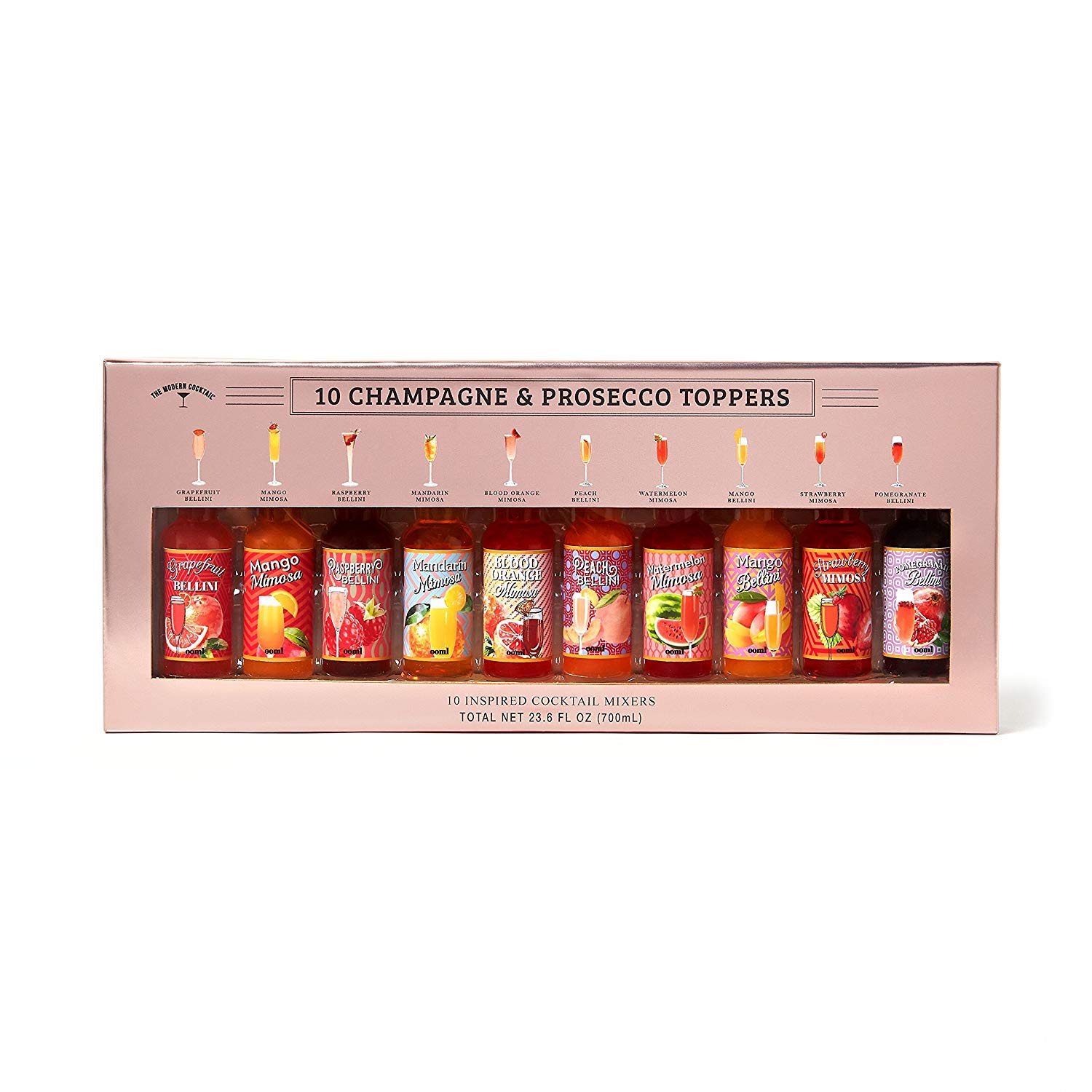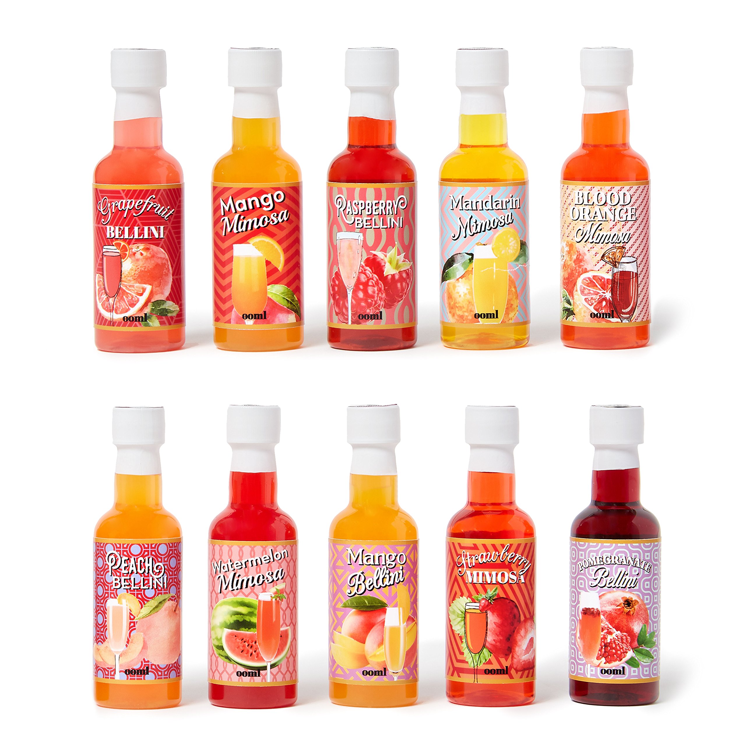 JUST ADD ALCOHOL – The gift box contains 10 different fruit-flavoured drink mixes to try, including Mango, Raspberry, Peach, Mandarin, and many more! Just add champagne or prosecco for a refreshing drink!