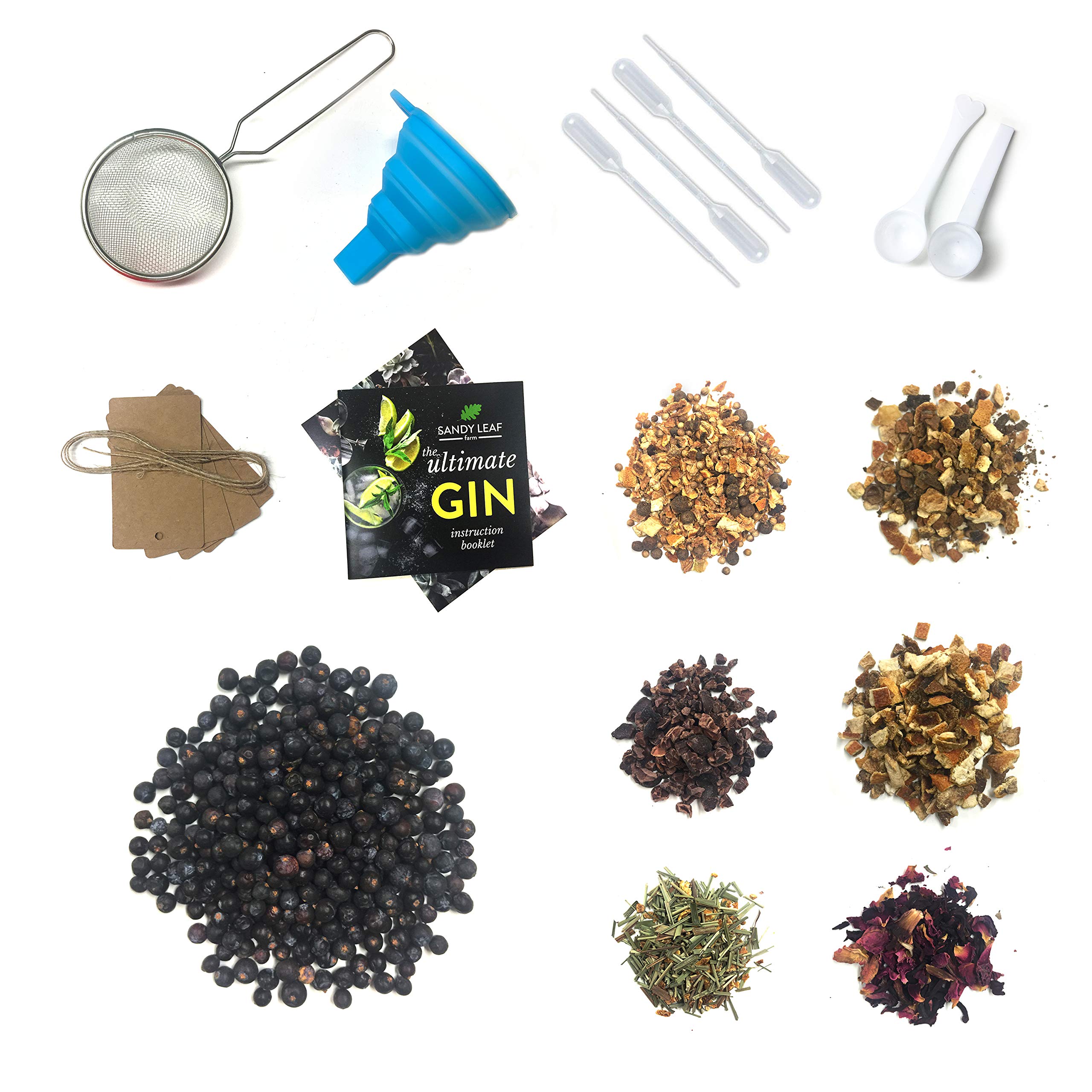 Includes: Clear instructions, juniper berries, botanicals, funnel, metal strainer, kraft paper bottle tags, testing pipettes