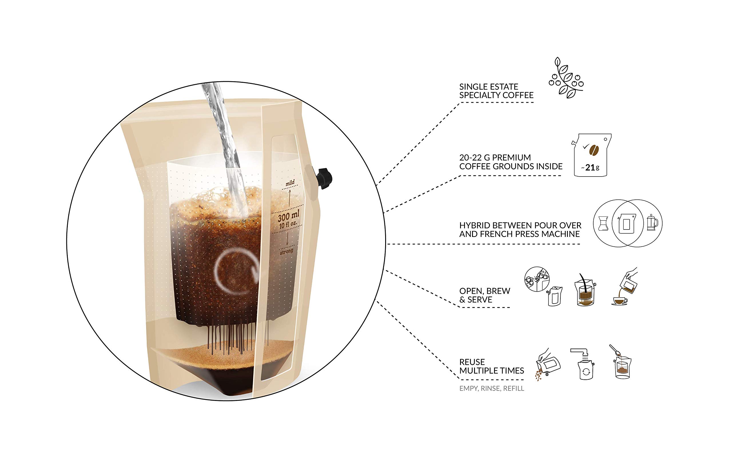 Hybrid between the pour over and French coffee – Just Open, Brew & Serve straight from the bag!