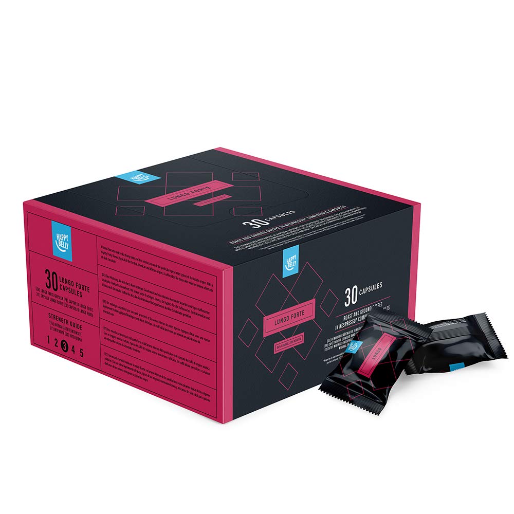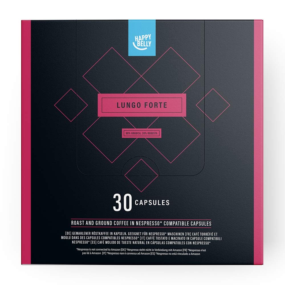 Amazon Brand- Happy Belly Lungo Forte Roast & Ground UTZ Coffee in Nespresso compatible compostable capsules, 30 capsules