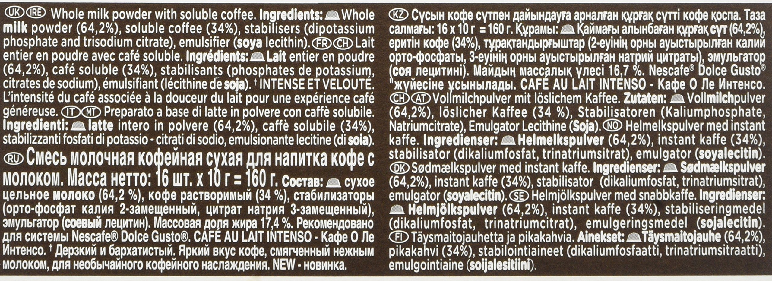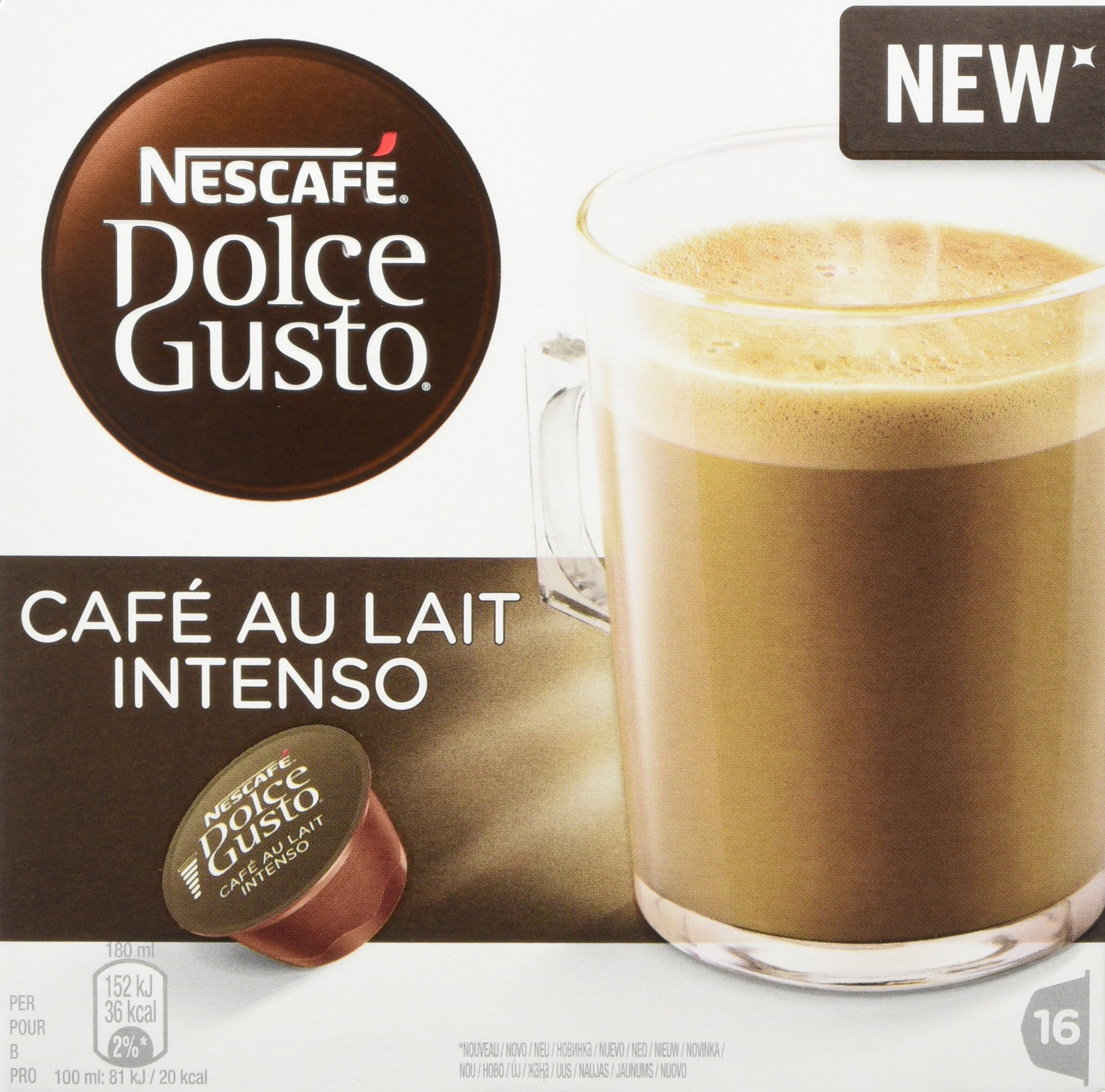 The box accommodates 16 tablets of NESCAFÉ Dolce Gusto Cafe Au lait Intenso, designed for NESCAFÉ Dolce Gusto capsule coffee machines