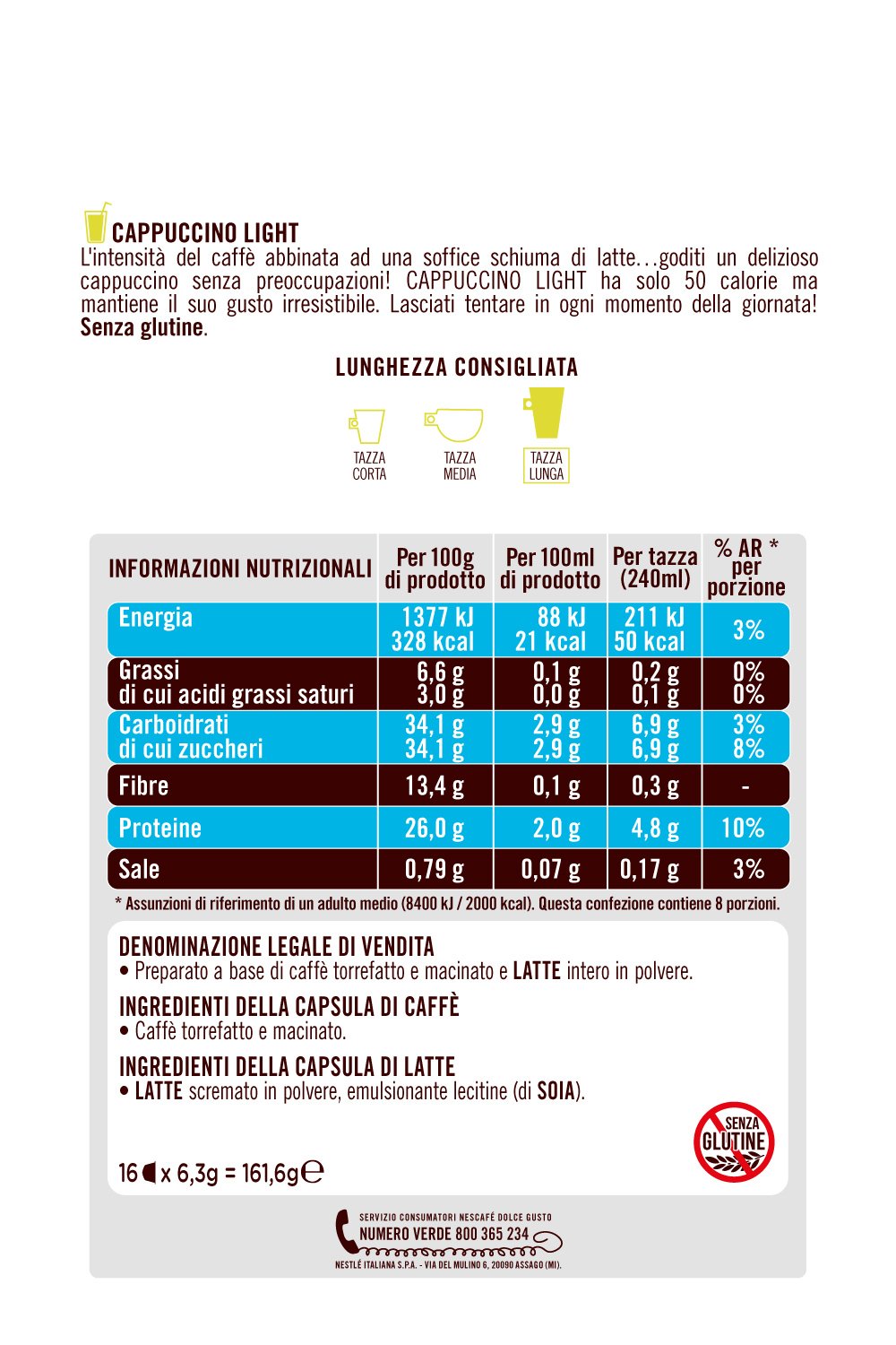 Nescafà Dolce Gusto Skinny Cappuccino, 16 Capsules (8 Servings): An espresso shot topped with deliciously frothy milk: low fat and 49 calories a cup. It’s no marvel that Cappuccinos are so popular. The serious shot of espresso, all that delightful froth, a mild dusting of chocolate… Well now you’ll be able to experience our delicious Cappuccino with out feeling guilty! Tailor-made on your 11 o’clock break, it’s low in fat, low on calories and filled with flavour! , Ingredients:Nescafà Dolce Gusto Skinny Cappuccino, 16 Capsules (8 Servings): Coffee capsule: Roasted ground coffee Milk capsule: skim milk powder, emulsifier (soya lecithin) , Pack comprises:3 x 1 pack Dolce Gusto Skinny Cappuccino with 16 capsules for 8 servings Pack comprises: 8 capsules with 7g Espresso + 8 capsules with 13.2g milk Net weight: 161.6g / pack