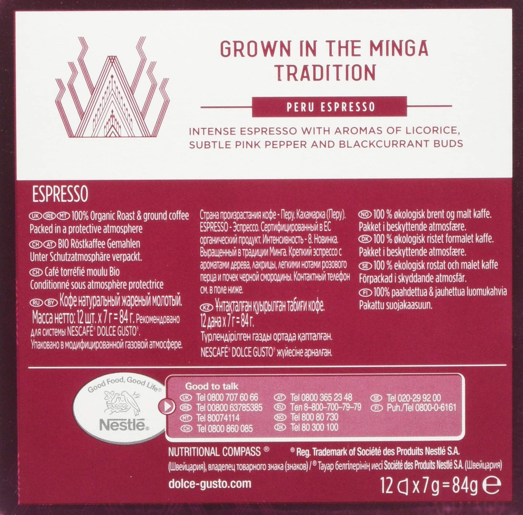 The box incorporates 12 capsules designed for NESCAFÉ Dolce Gusto capsule coffee machines so that you can get ready 12 mugs of NESCAFÉ Dolce Gusto Peru Cajamarca Espresso.