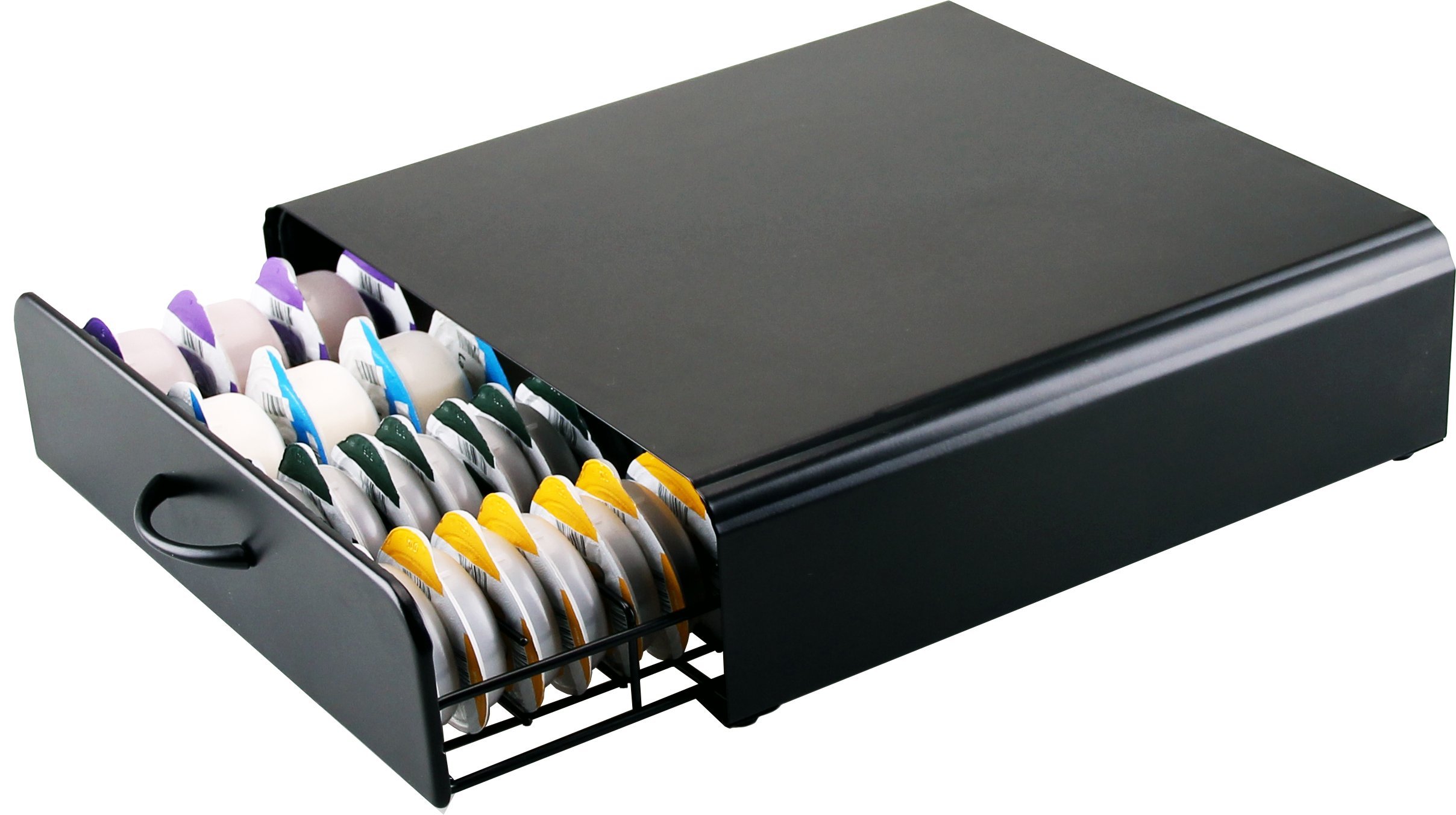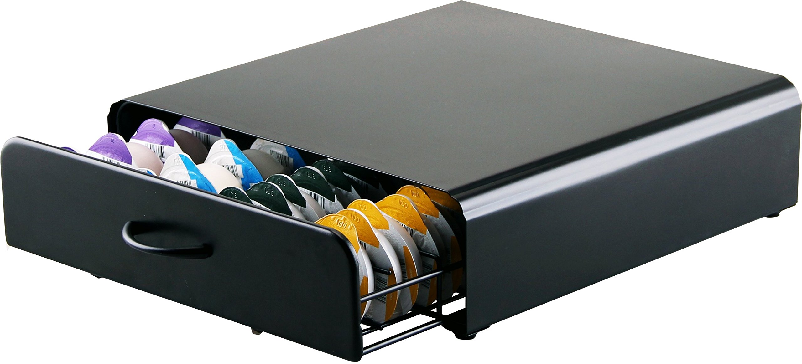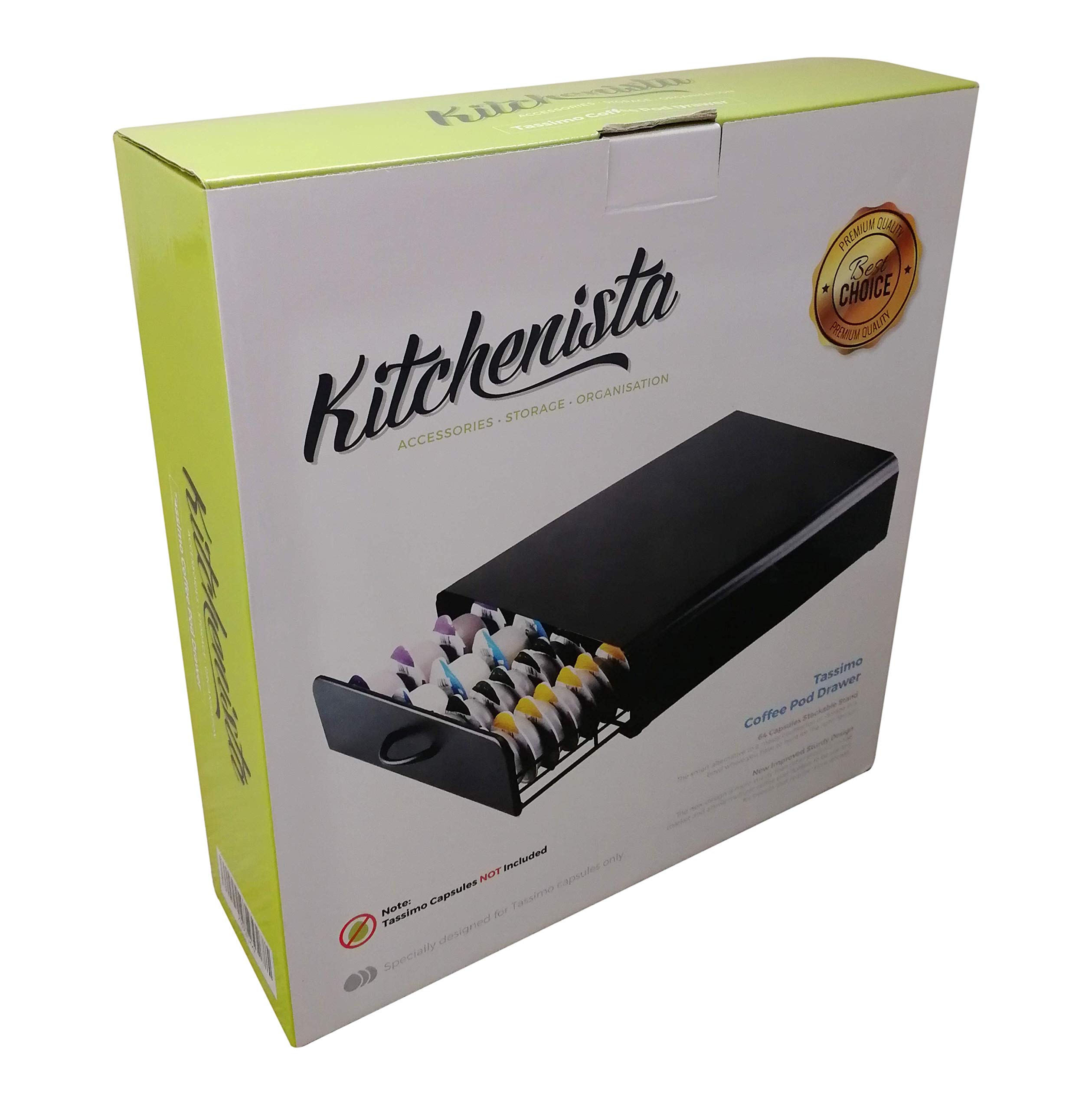Tassimo Pod Holder in matte black. The sliding drawer holds 64 coffee capsules The smart alternative to a messy countertop or storage in a bowl where it’s a must to hunt for the proper flavour