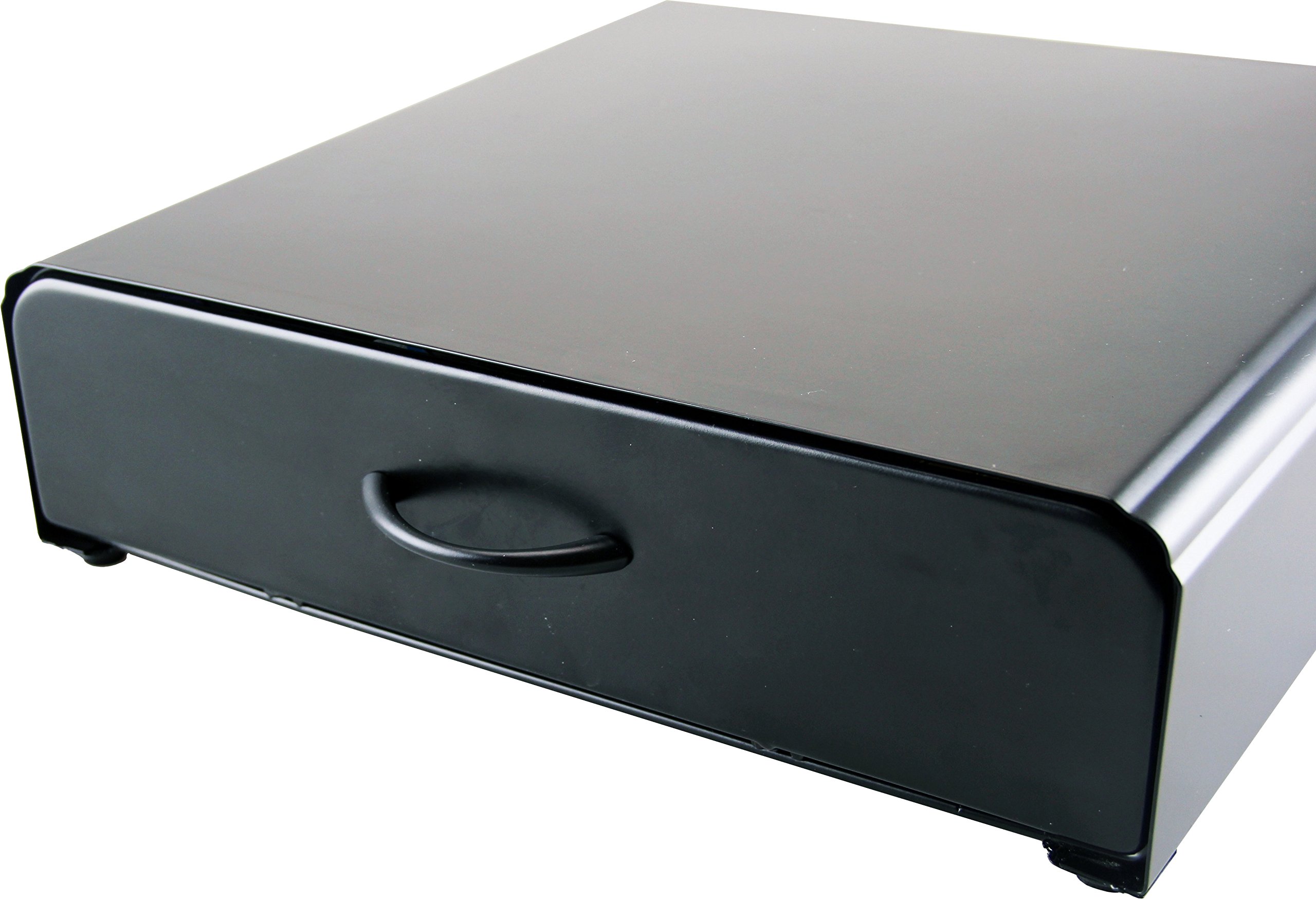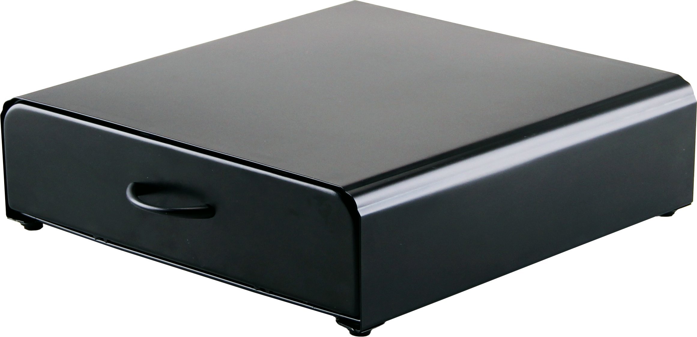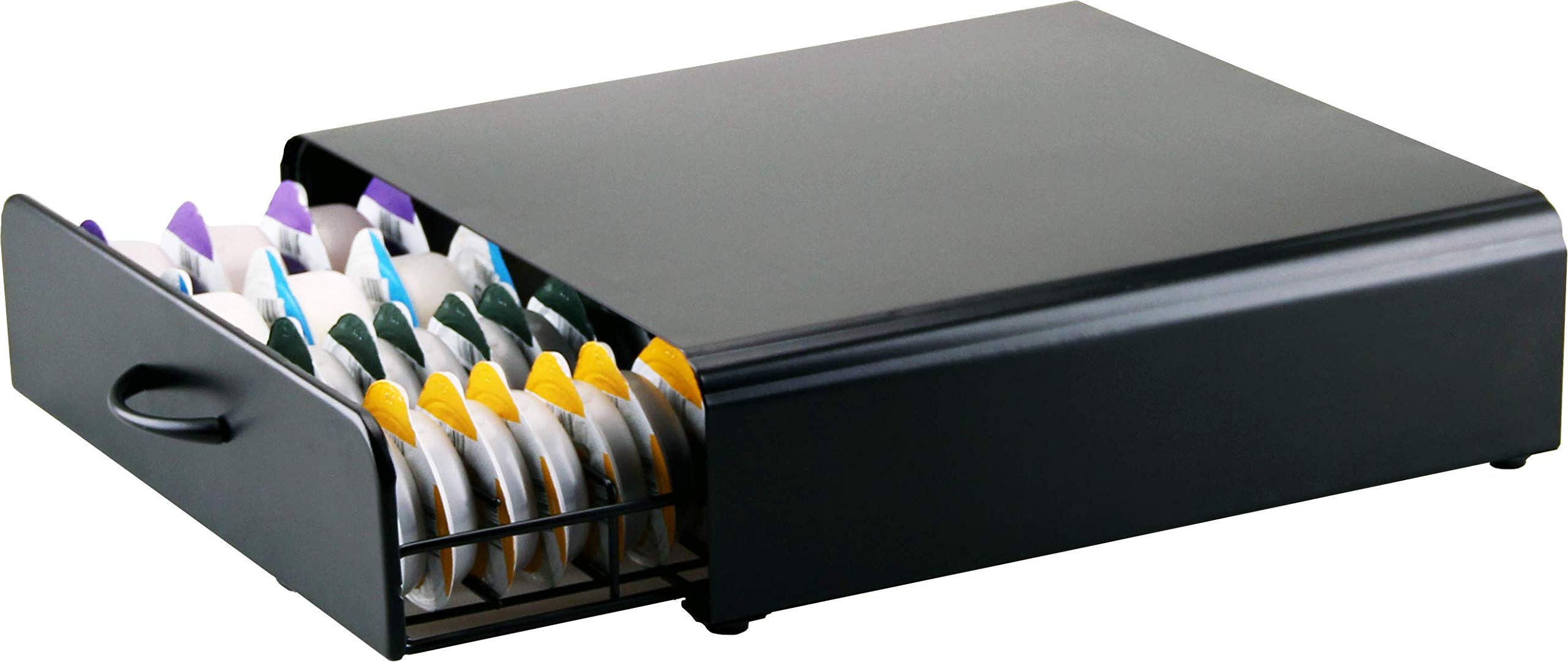 Tassimo Pod Holder in matte black. The sliding drawer holds 64 coffee capsules The smart alternative to a messy countertop or storage in a bowl where it’s a must to hunt for the proper flavour