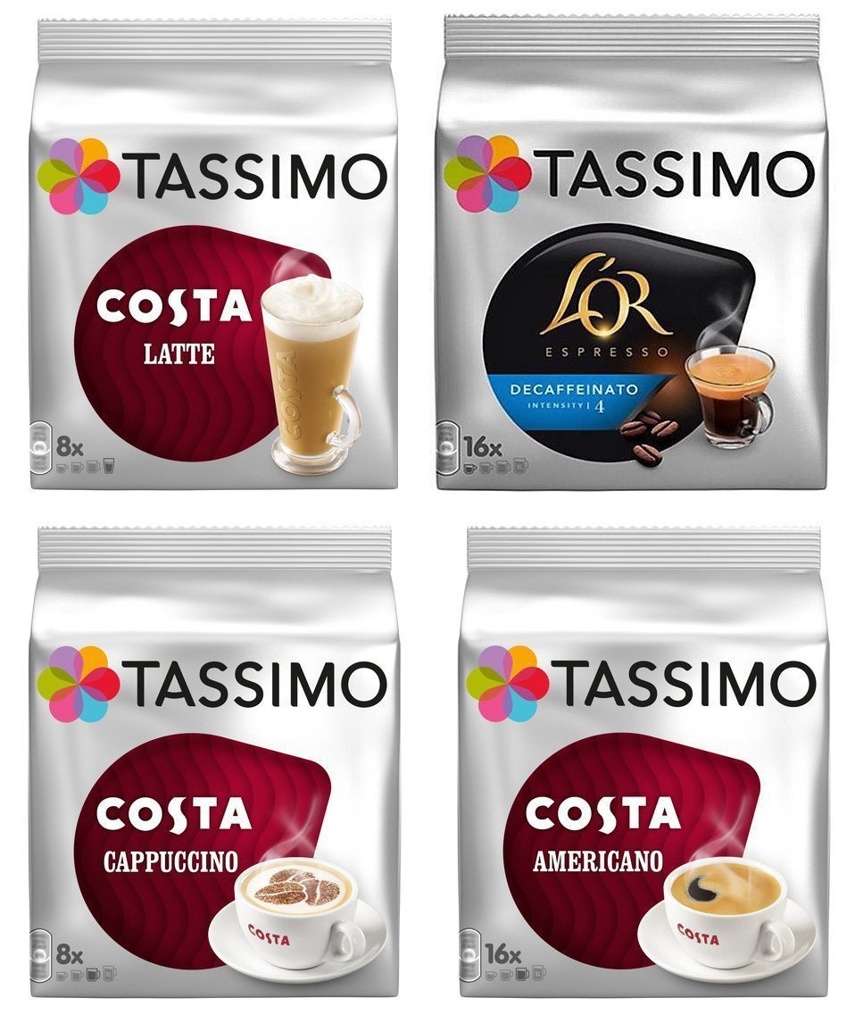 Tassimo Ultimate Bundle – Costa Latte/Cappuccino/Americano, L’Or Espresso Decaffeinato – Pack of 4 (48 Servings)