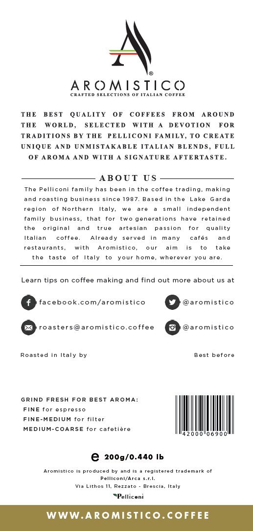 Visit WWW.AROMISTICO.COFFEE for more details on all our coffees. We offer the best quality of coffees from world wide, selected with a devotion for traditions, to create unique and unmistakable Italian blends, full of aroma and with a signature aftertaste. We are a small independent Italian family business with an original and true artesian passion for quality Italian coffee. All our coffee is hand roasted in Italy in small batches and it is left to dry and mature in the Italian air of the Lake Garda region. Distinguished coffee flavour and its aftertaste aren’t only decided by the beans and their roast, but also by the entire basic surrounding elements like air, temperature, climate and water. Aromistico coffee lets you bring a little piece of Italy and its history into your home.