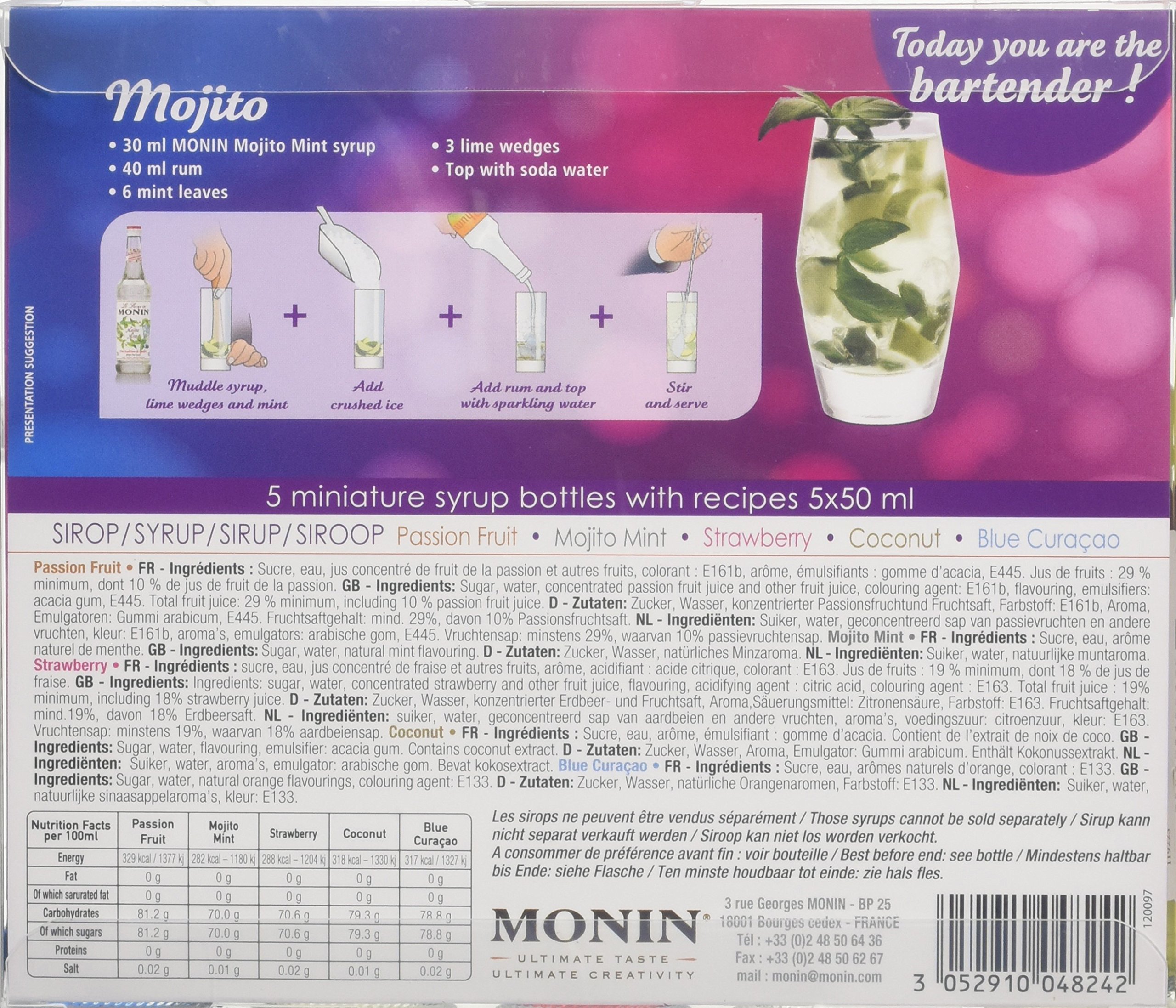 A collection of 5 miniatures of Monin syrups. The set incorporates one Every in their passion fruit, mojito mint, grenadine, coconut and blue curacao flavours. A fantastic gift for any