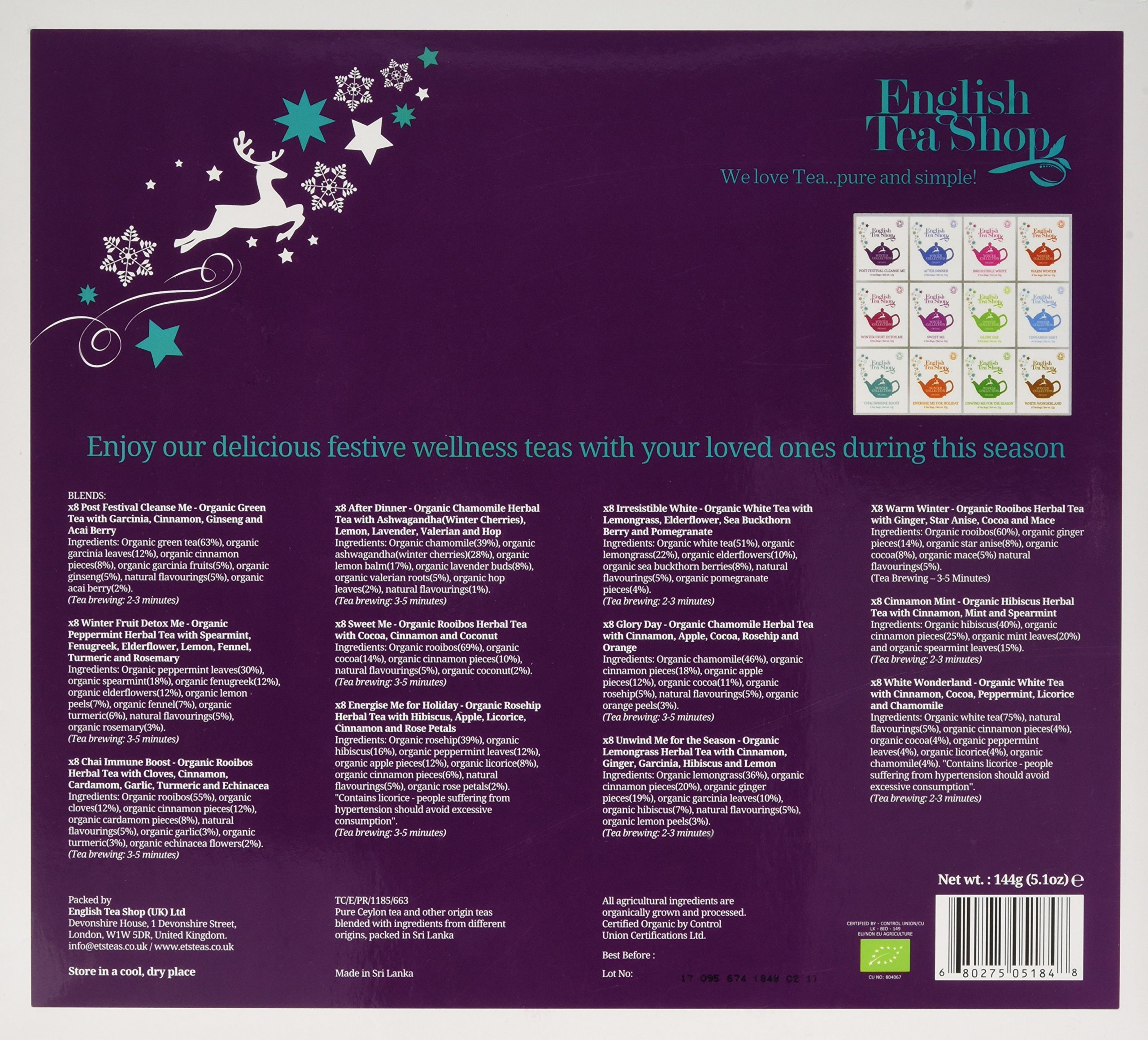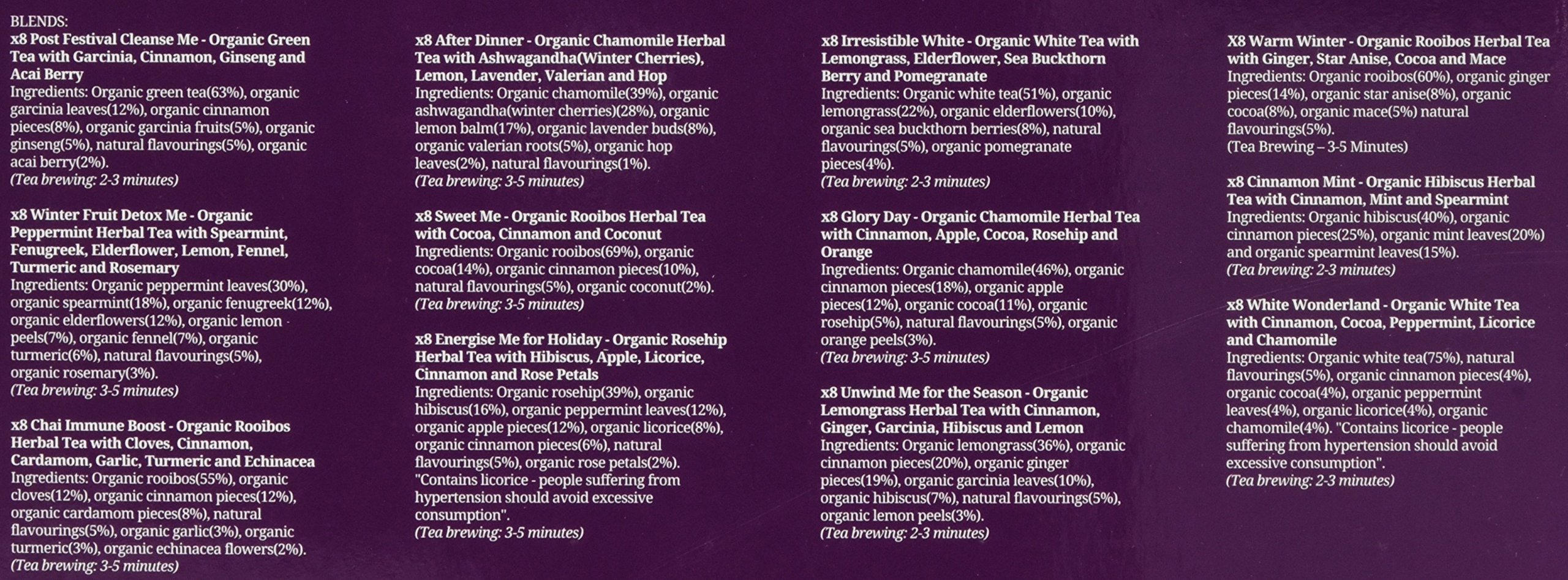 English Tea Shop Winter Collection White Tray is a delicious collection of tea perfect for the Holiday time, it contains 12 variations of tea and with 8 bags of each equal to 96 bags: Post Festive Cleanse Me, Winter Fruit Detox Me, Chai Immune Boost, After Dinner, Sweet Me, Energise Me for Holday, Irresistible White, Glory Day, Unwind Me for the Season, Warm Winter, Cinnamon Mint, White Wonderland.