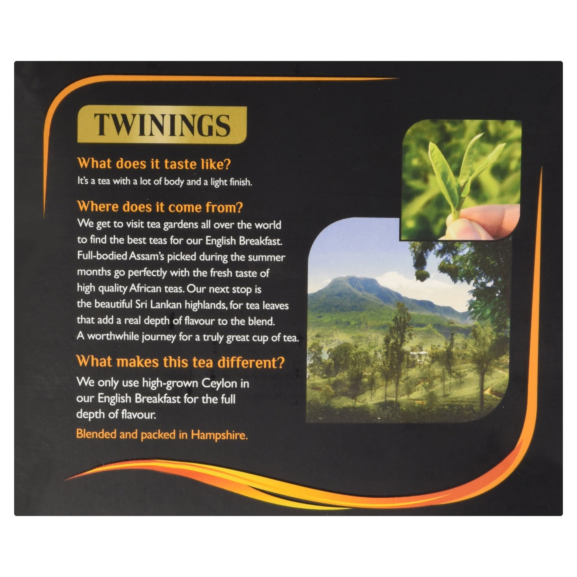 A mixture ceylonesischer and Indian Tee with an imaginative taste, usually English. For some it’s Speck breakfast and eggs. Eat a Bowl so can other cereals. But some of the