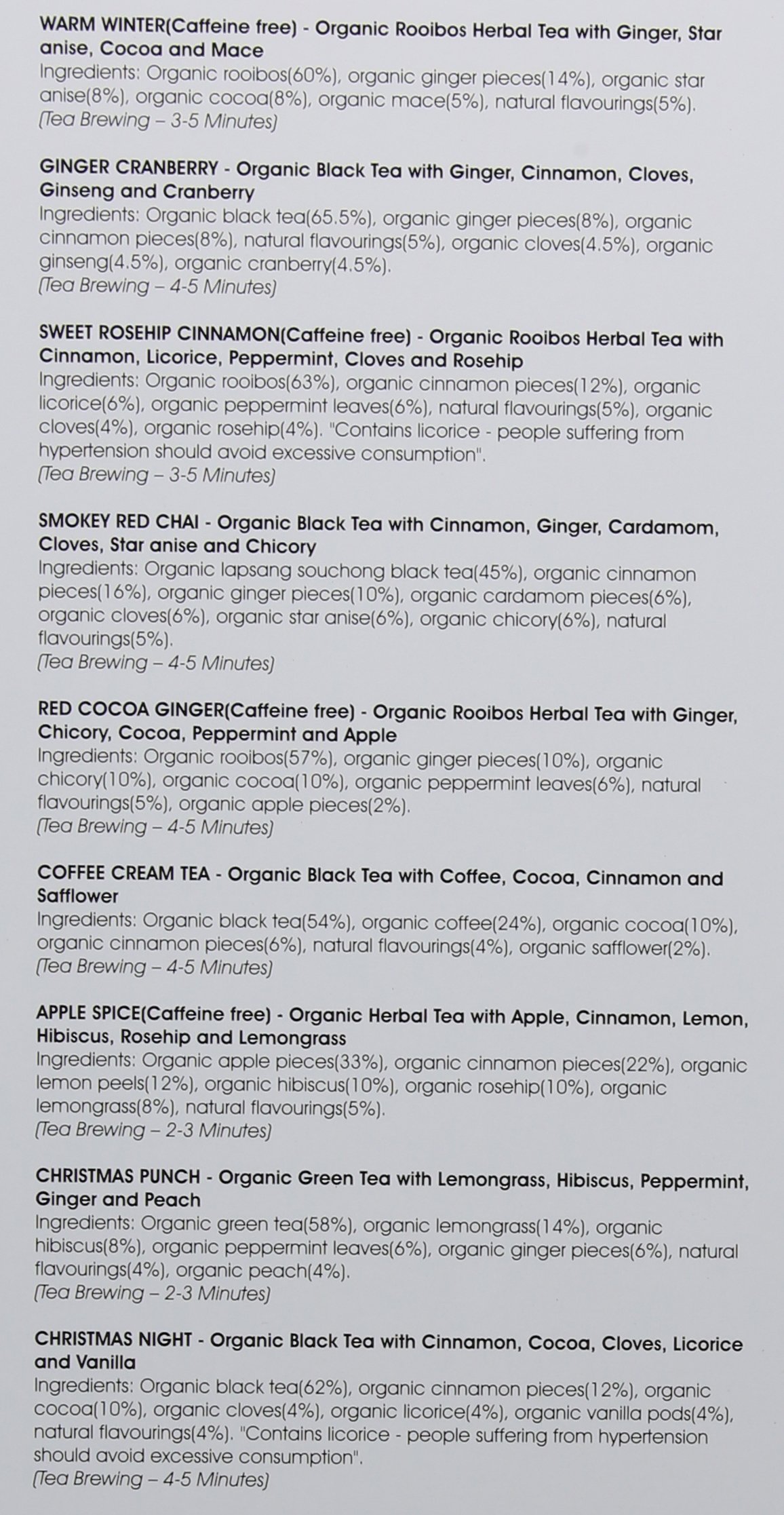 We like good tea. Refreshing, invigorating, robust or soothing, our love for tea infuses the whole lot we do: from mixing in our factory in Sri Lanka to the freshly brewed cup. But tea is a lot more than this. We care about everyone in our supply chain. From binders to packers, blenders, drinkers. Small agriculture, organic, fair and sustainable are words with regards to our hearts. Not just for the have an effect on they’ve on our business, but additionally for the generations to return. Our tea comes from Sri Lanka with love. You. Loving. Care. – Latta collection “Christmas Tea” – 72 bags mixed tea in single bags (Grams 108) – Blends: Warm winter (rooibos with ginger, star anise, nutmeg and cocoa), Ginger Blueberry (black tea with ginger, cinnamon, nails of carnation, ginseng and cranberry), sweet Rosehip and Cinnamon (Rooibos with cinnamon, licorice, peppermint, cloves and rosehip), smoked Chai (black tea with cinnamon, ginger, cardamom, cloves, star anise and chicory), Cocoa and Ginger (Rooibos with ginger, chicory, cocoa, peppermint and apple leaves), Coffee Cream Tea (Black tea, coffee, cocoa, cinnamon, safflower with natural vanilla), Flavored apple (Apple, cinnamon, lemon peel, hibiscus, rose hip and lemongrass), Christmas punch (green tea, lemongrass, hibiscus, mint leaves, ginger, peach), Christmas Night (black tea, cinnamon, cocoa, cloves, licorice and vanilla). Made in Sri Lanka. Biological.