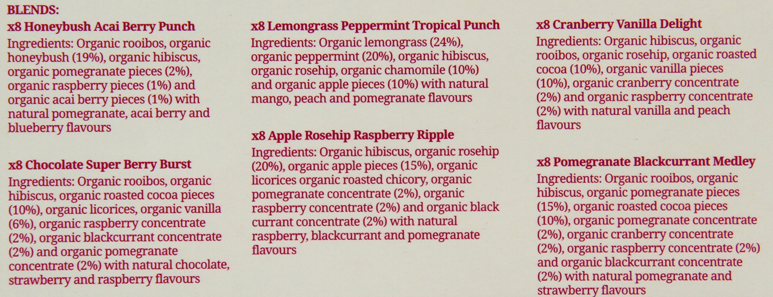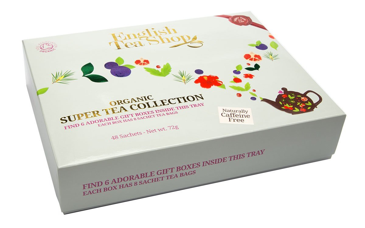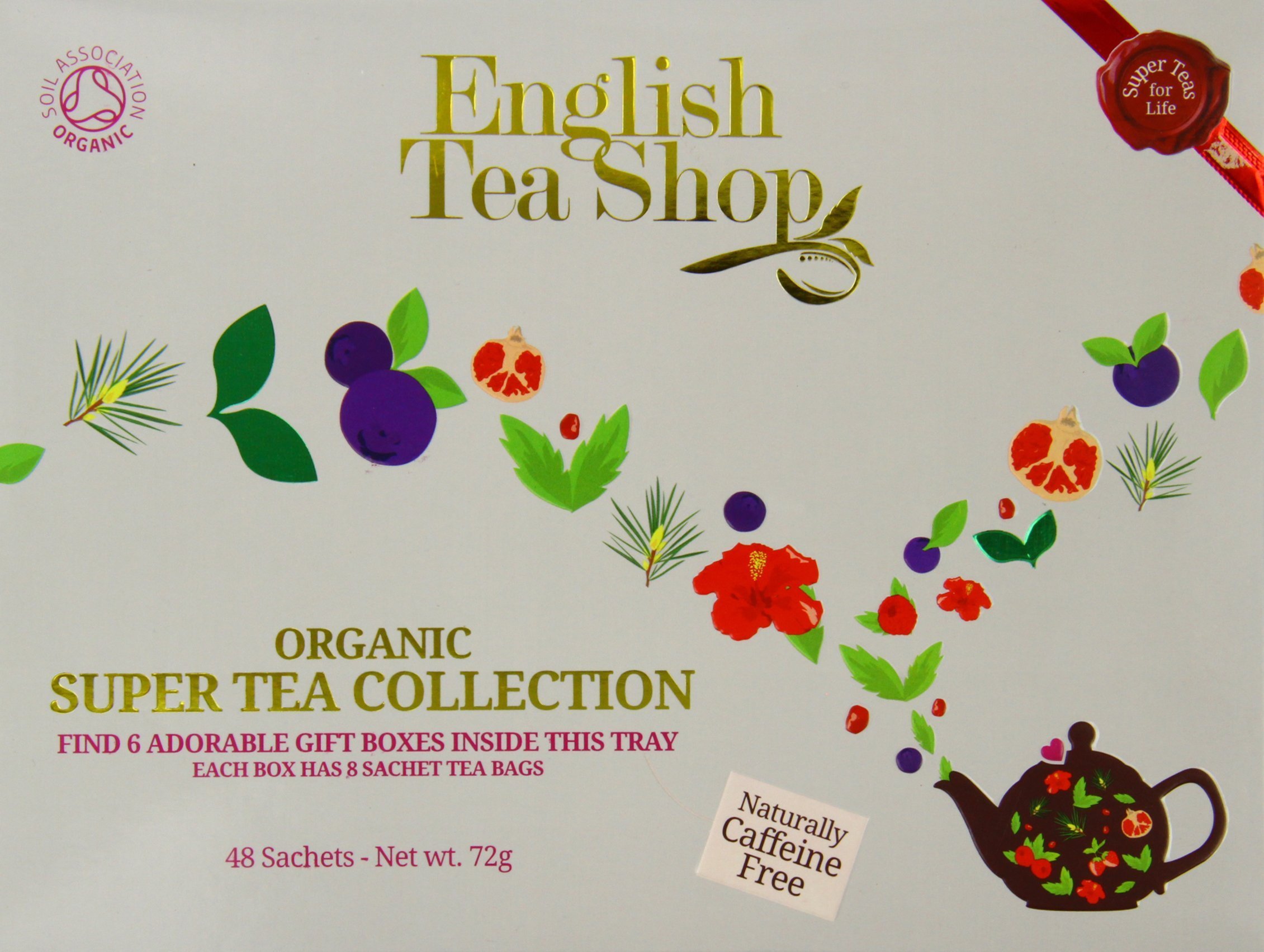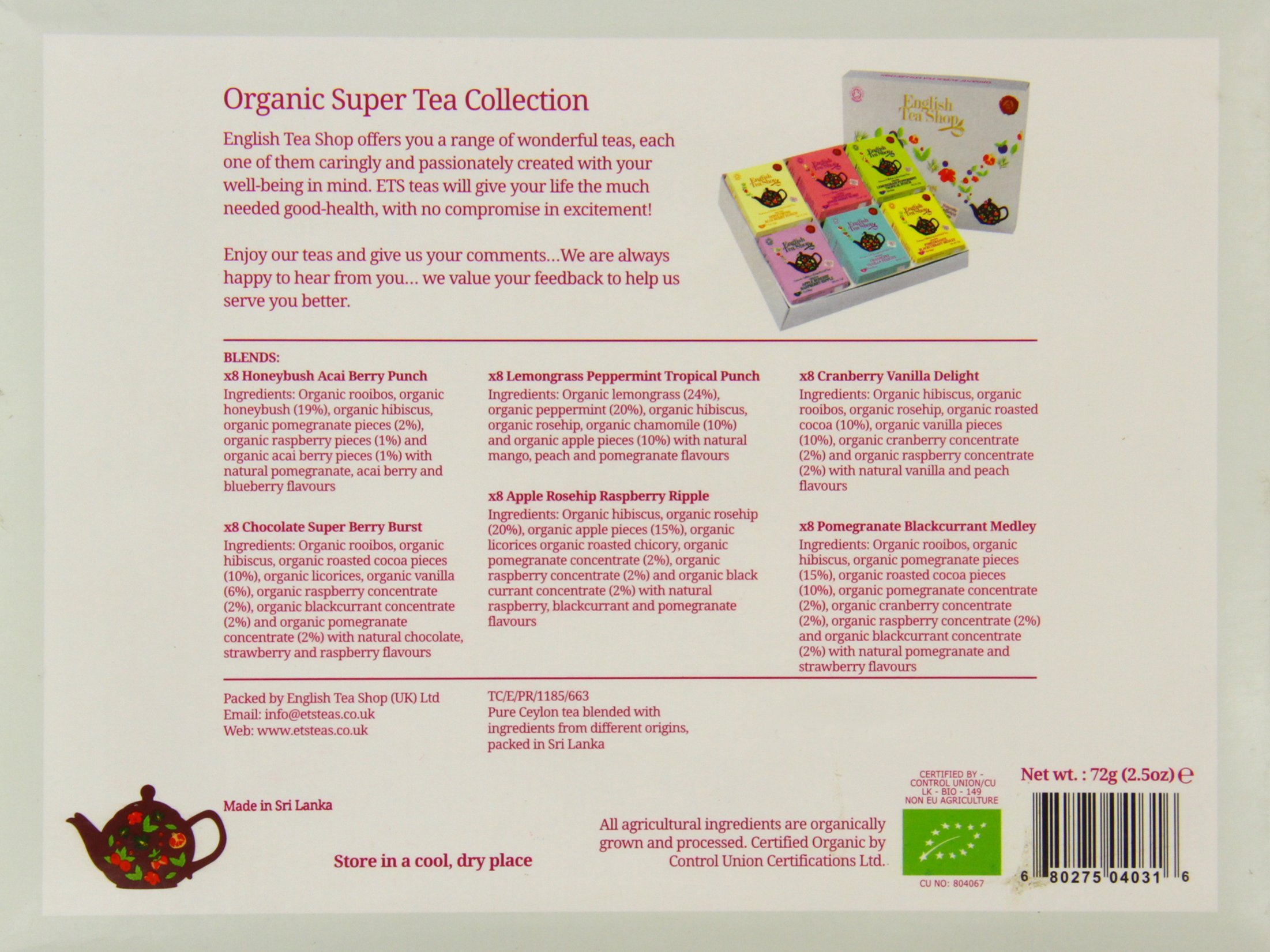 English Tea Shop Organic Tea Collection contains 6 adorable gift boxes inside, each box has 8 sachet tea bags of different flavours: Honeybush Acai Berry Punch, Lemongrass Peppermint Tropical Punch, Cranberry Vanilla Delight, Chocolate Super Berry Delight, Apple Rosehip Raspberry Ripple, Pomegranate Blackcurrant Medley.