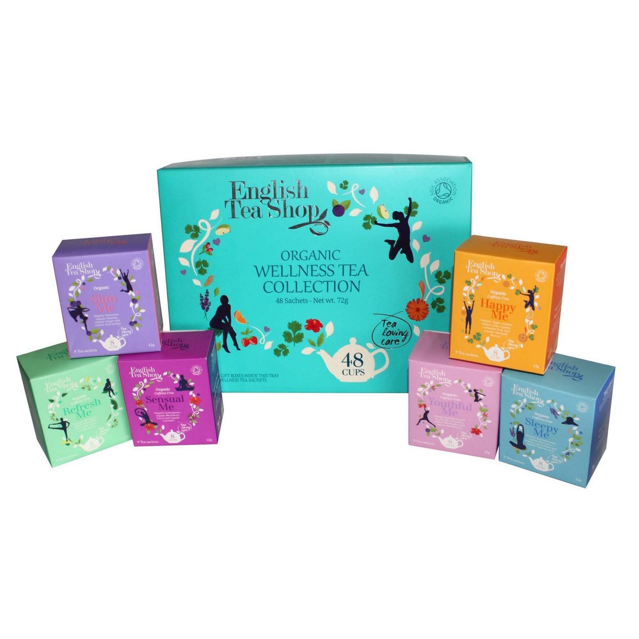 English Tea Shop Organic Wellness Tea Collection. 48 sachets included in box: 8 x Happy Me Sachets, 8 x Sensual Me Sachets, 8 x Youthful Me Sachets, 8 x Refresh Me Sachets, 8 x Sleepy Me Sachets, 8 x Slim Me Sachets.