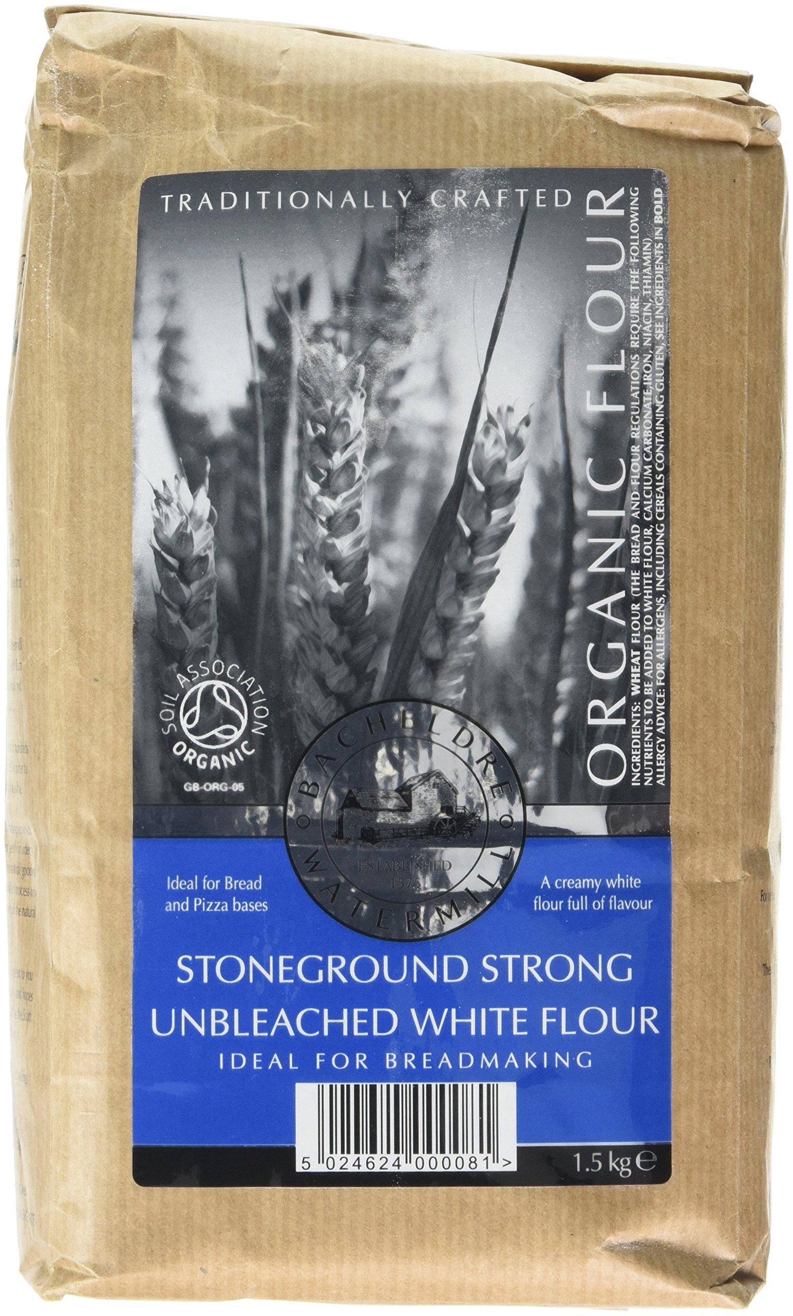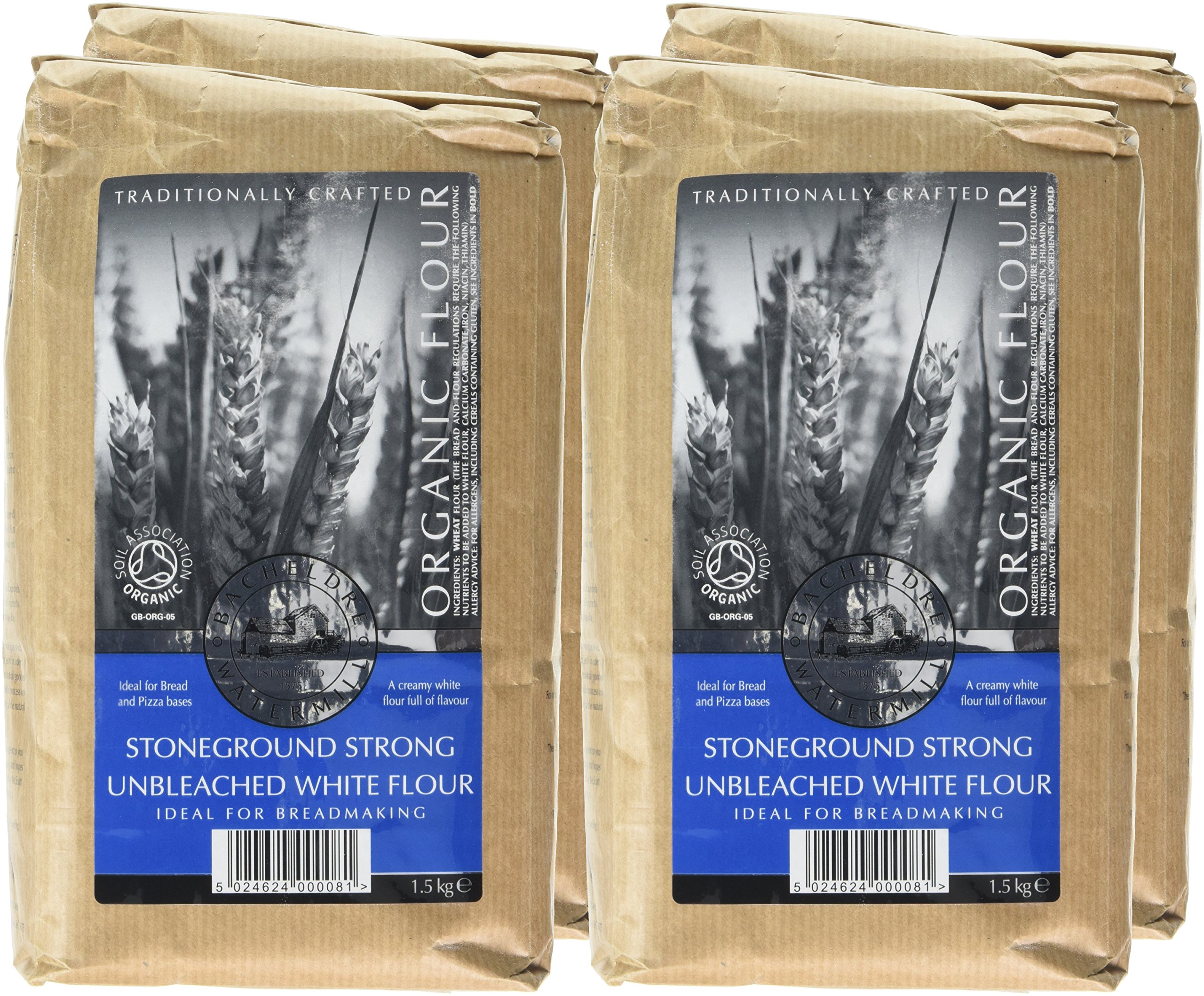 Bacheldre Watermill Organic Stoneground Strong Unbleached White Flour 1.5 kg (Pack of 4)