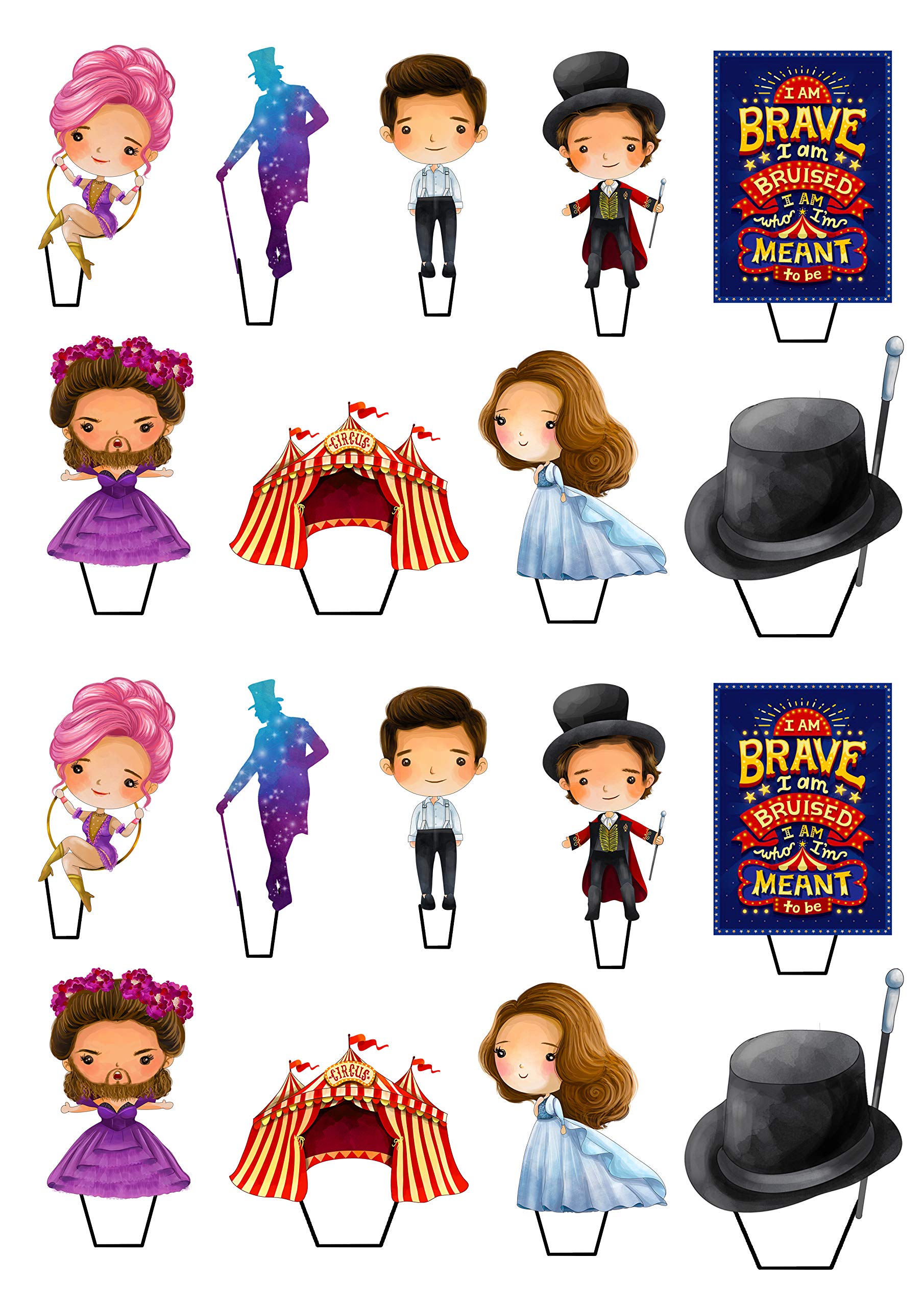 Our toppers are constituted of top of the range, wafer card which is much thicker than standard rice or wafer paper. Each and every topper has a small tab on the bottom meaning they stand easily in both buttercream and regular icing. All images are high resolution, professionally designed and printed. The pack of 36 comprises four of Each and every design shown. The pack of 72 comprises eight of Each and every design. Each and every image is approx. 5cm at its largest point.