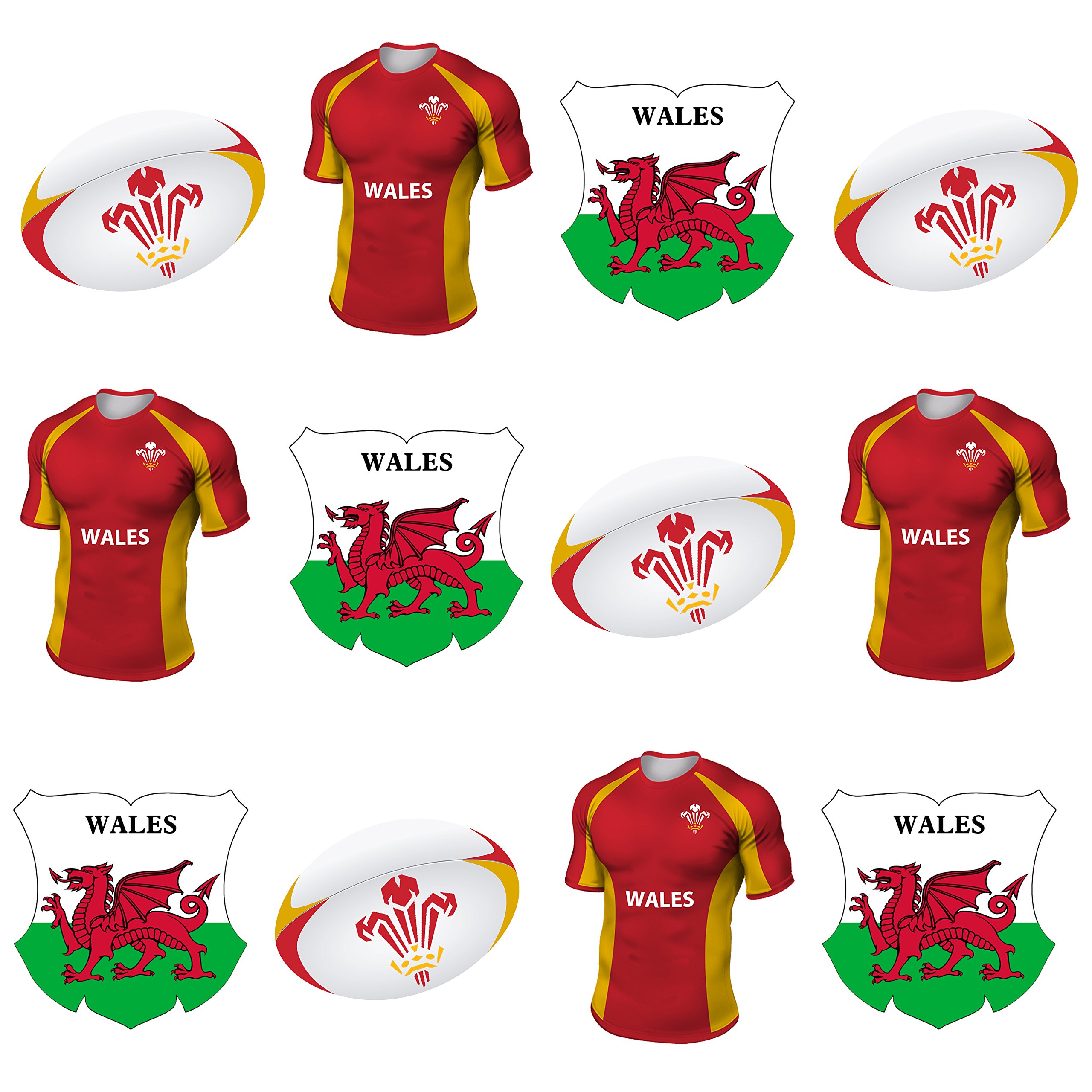 Wales Rugby Team Shirt, Ball and Flag Mix, Cake Decorations – Edible Stand-Up Cupcake Toppers (Pack of 12)