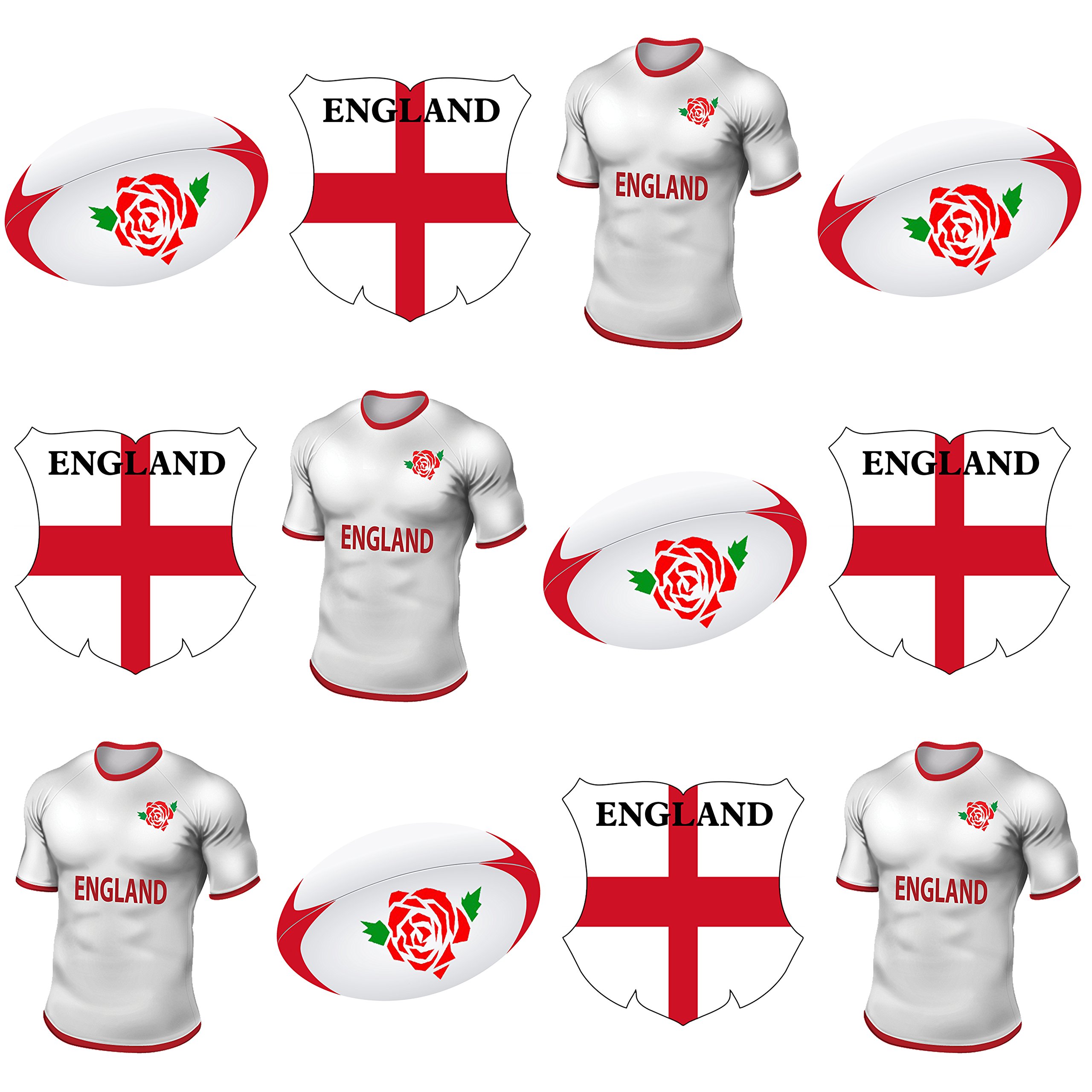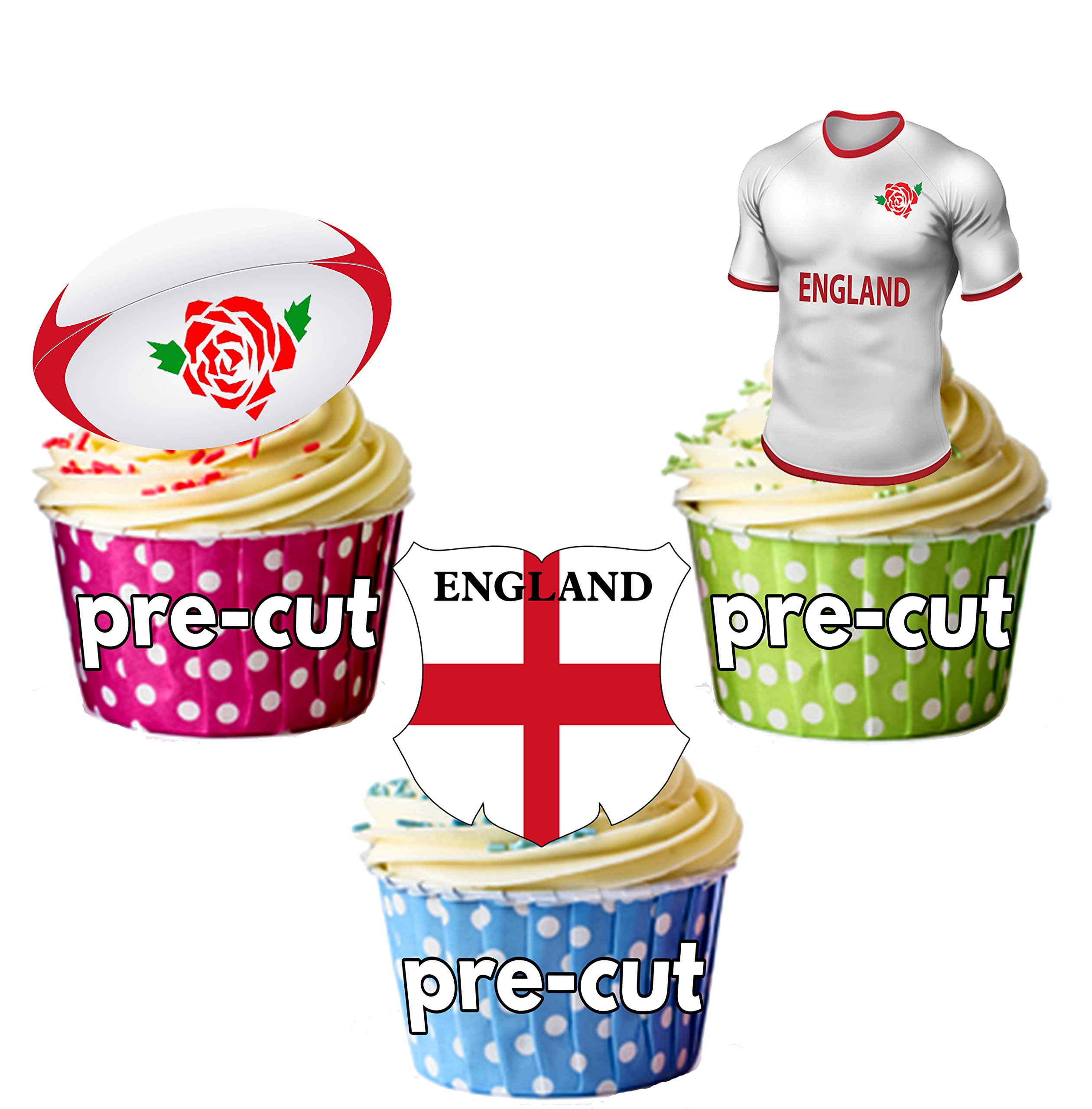 AK Giftshop PRECUT England Rugby Team – Shirt, Ball and Flag Mix – Edible Cupcake Toppers/Cake Decorations (Pack of 12)