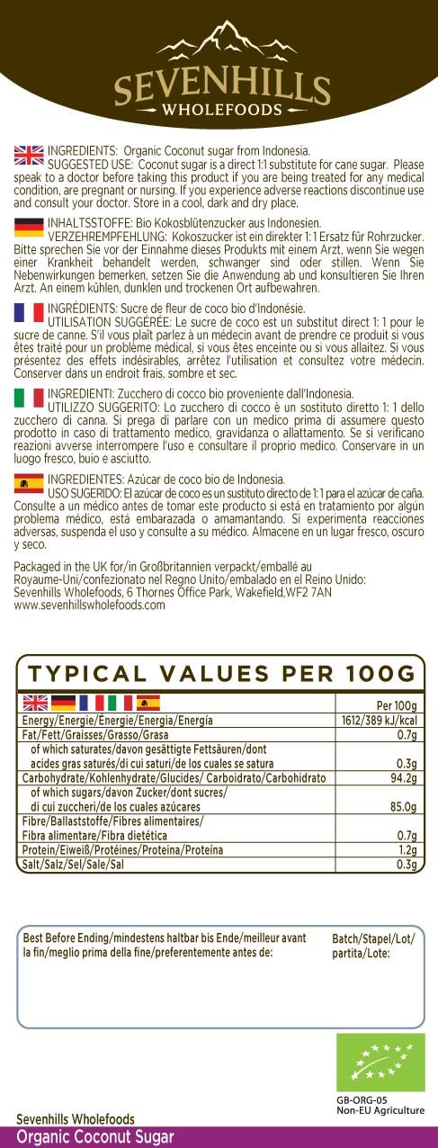 Organic Coconut Sugar is likely one of the healthiest types of natural sweetener. The sugar has a rich sweetness and a hint of caramel flavour, very similar to brown sugar. It has an unbeatable nutritional content which includes essential minerals, vitamins and amino acids. Compared to cane sugar, our Coconut Sugar has a lower glycaemic index, this means that it is absorbed slower. Sevenhills Organic Coconut Sugar is sourced from Indonesia and made by evaporating the nectar harvested from the coconut palm flour. Once the sugar has been granulated, it is sieved to verify there are no fibres remaining. Packaged in the United Kingdom.