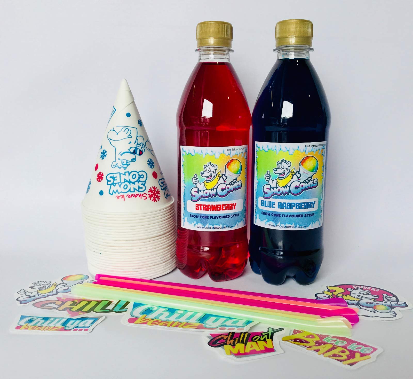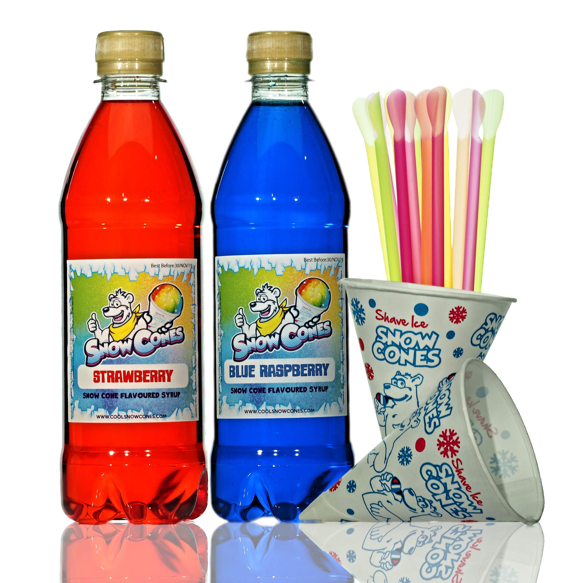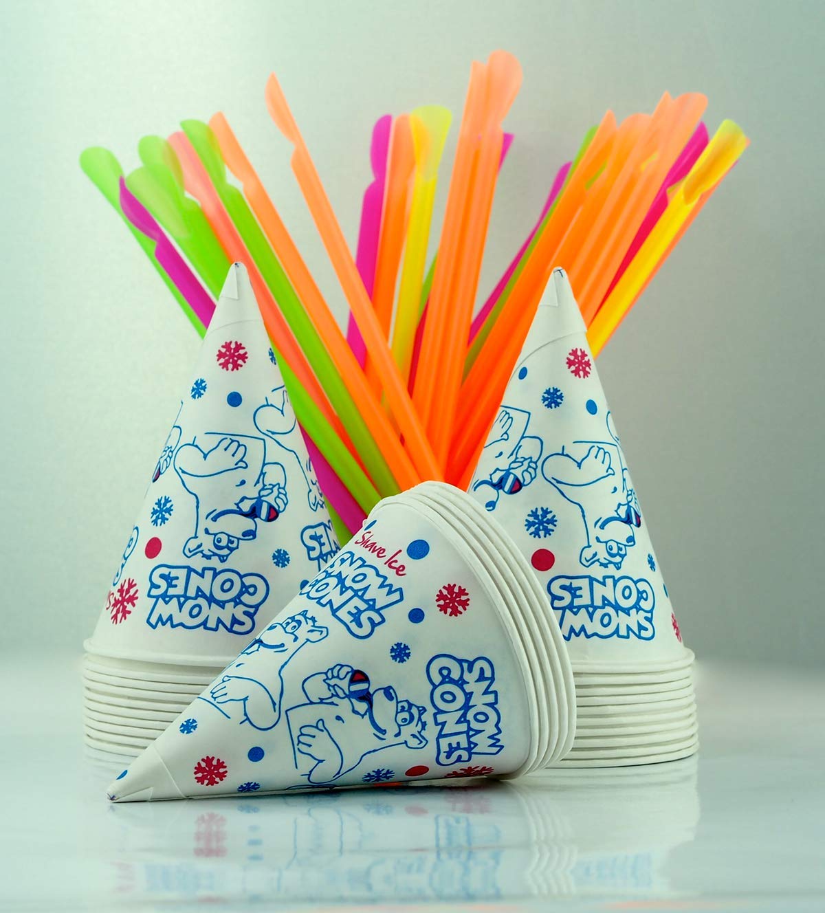 Package includes 25 FREE fully branded Wax paper Snow Cones plus 25 FREE straw spoons