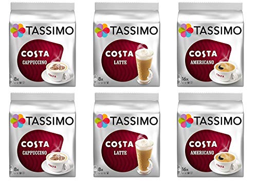 Tassimo Coffee Costa Bundle - Costa Latte/Cappuccino/Americano pods - Pack of 6 (64 Servings)