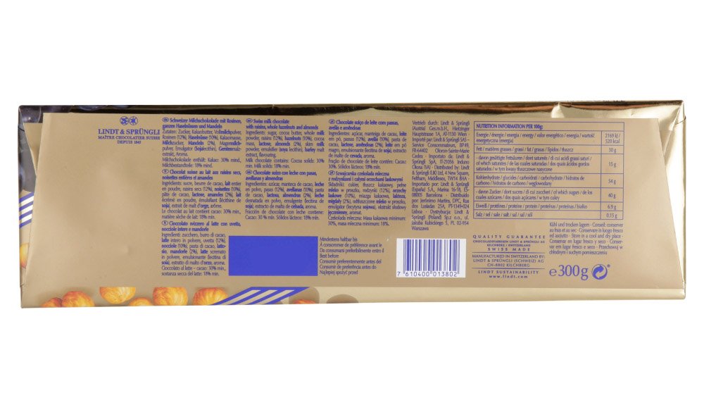 Revel in Lindt’s signature smooth and creamy tasting Swiss milk chocolate combined with delicious raisins and lightly roasted hazelnuts and almonds for extra bite