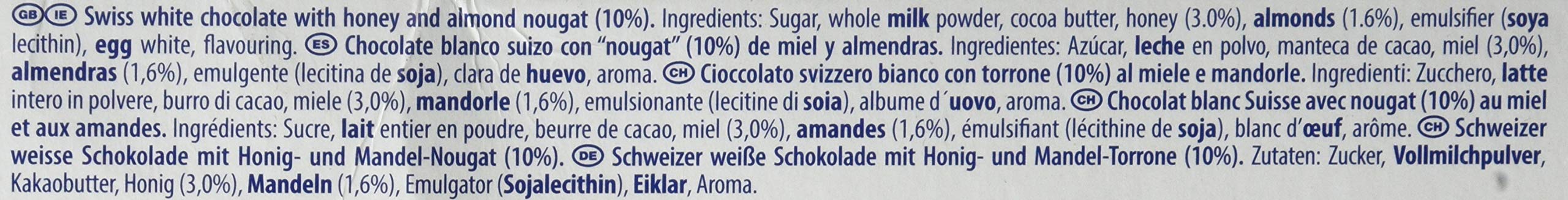 Creamy white chocolate with delectable honey and almond nougat