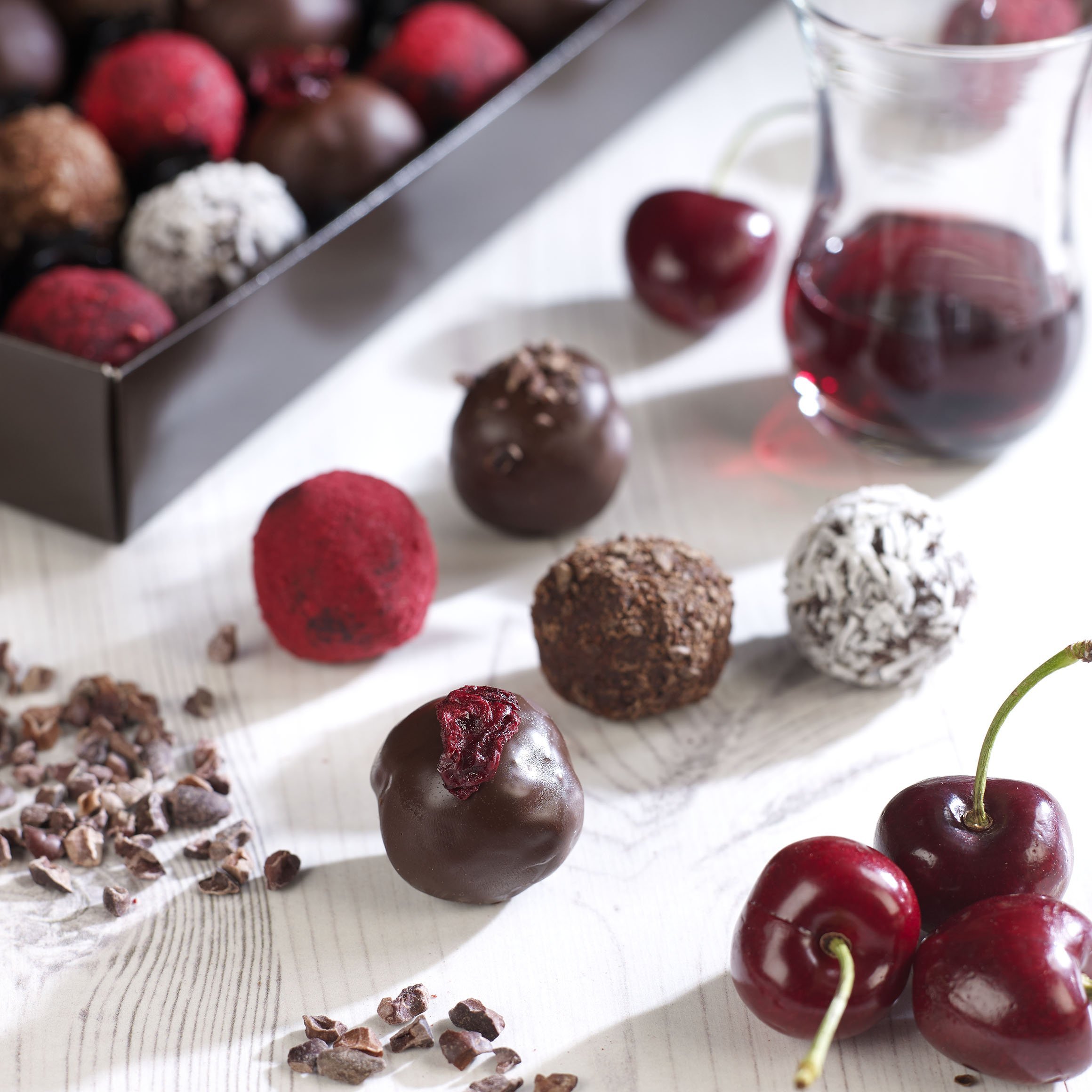 A gorgeous mix of 5 rich dark chocolate truffles; chocolate chocolate, raspberry chocolate, sour cherry & kirsch chocolate, coconut chocolate and rum chocolate.
