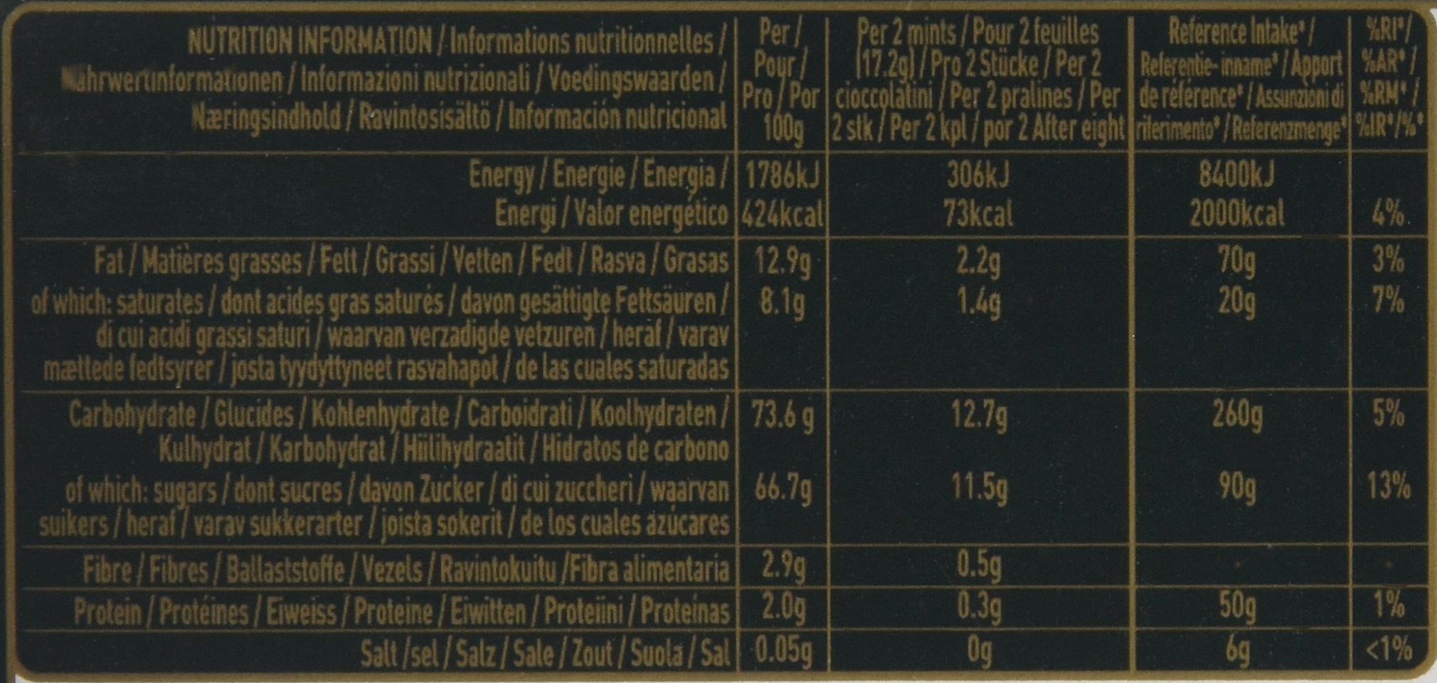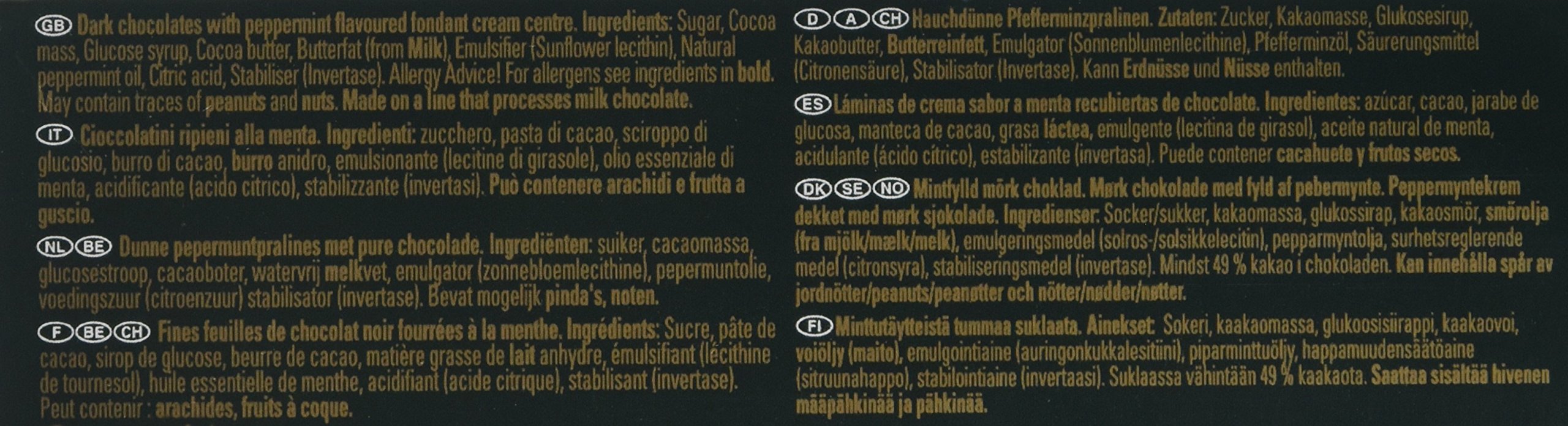 Wafer skinny items of mint fondant wrapped in darkish chocolate each and every in their very own crisp envelope