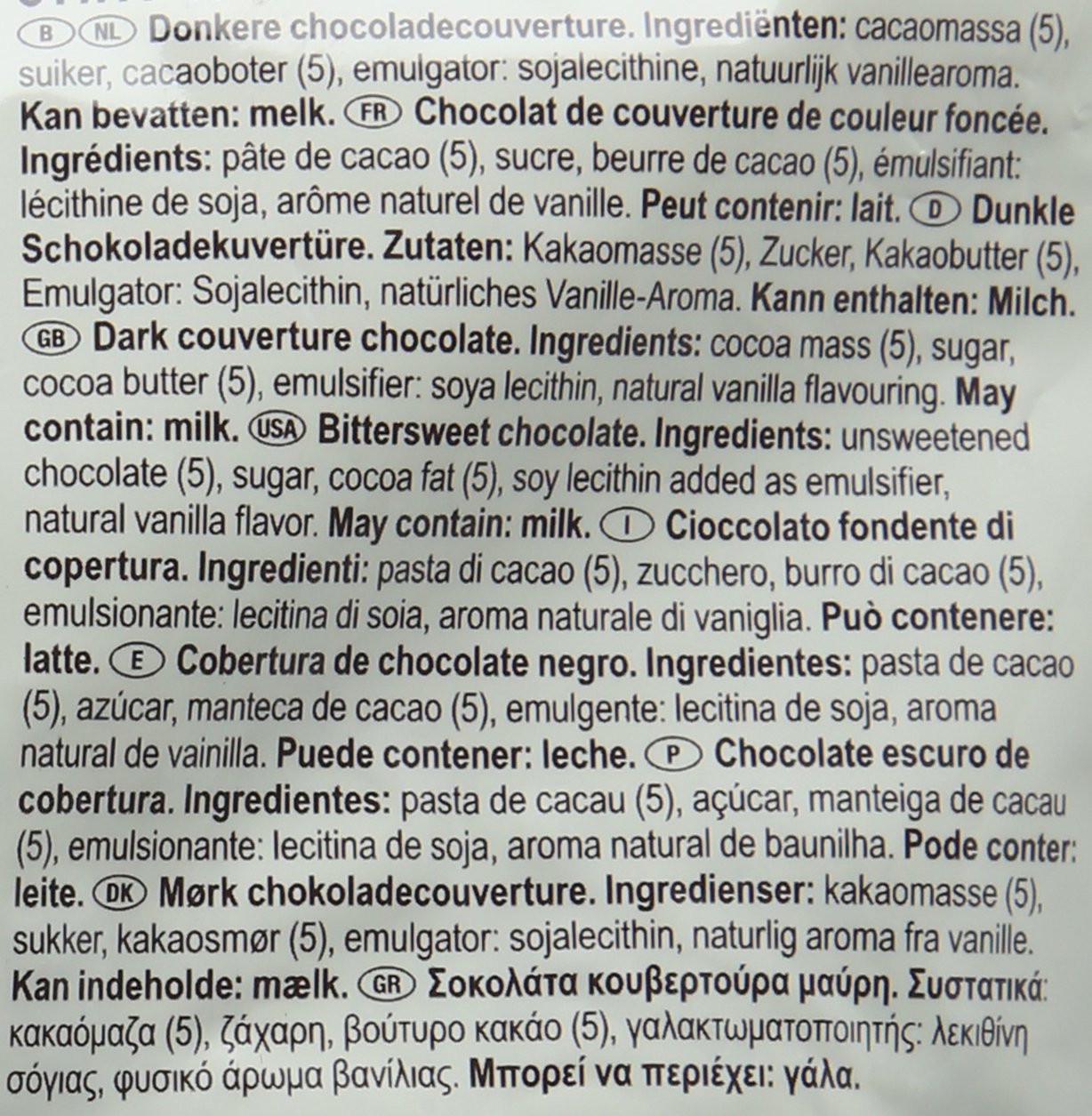 Allergens highlighted in boldBelgian milk chocolate Couverture (Min cocoa 53.8%), Sugar, Cocoa butter, Whole milk powder, Cocoa mass, Emulsifier; Soya lecithin, Natural vanilla, Certified Kosher may contain traces of:
