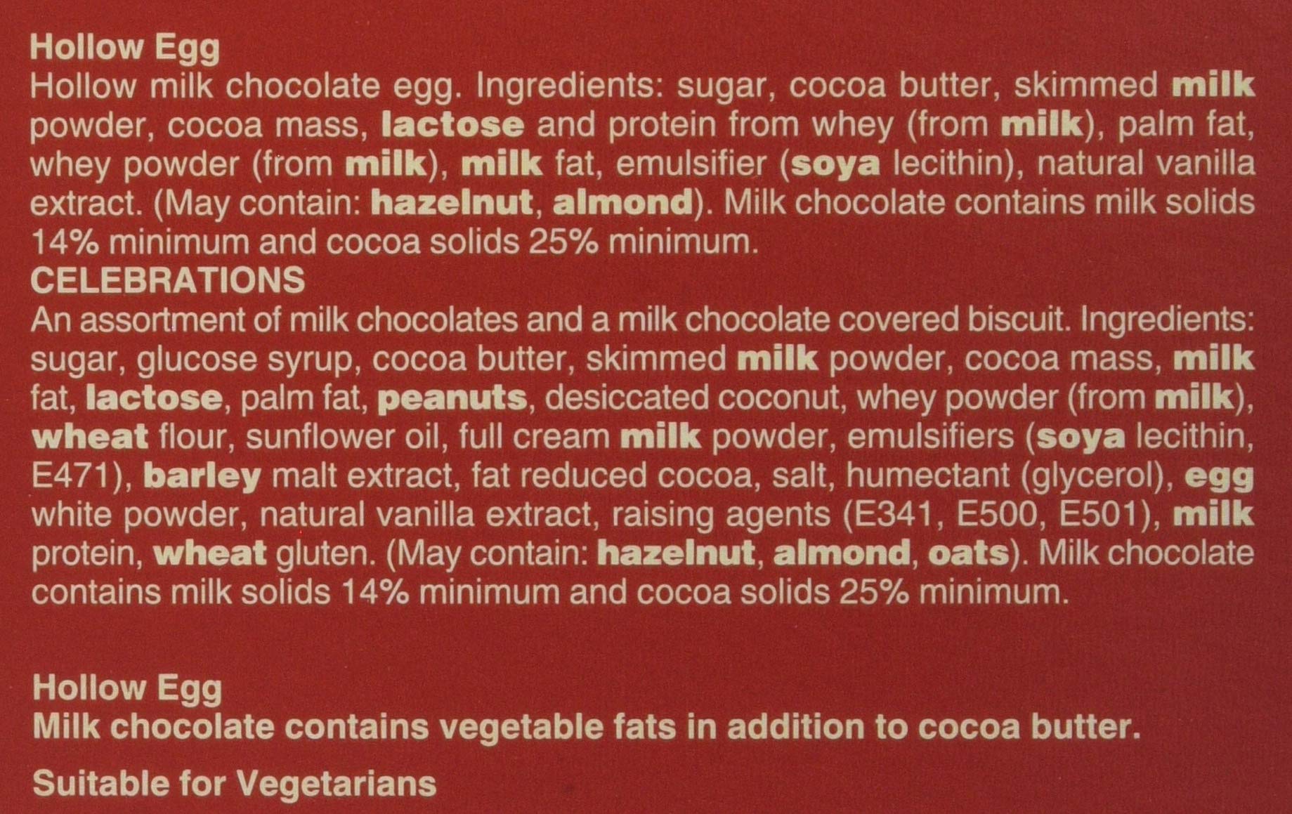 Each and every egg Comprises one hollow milk chocolate egg and a number of Celebrations chocolates
