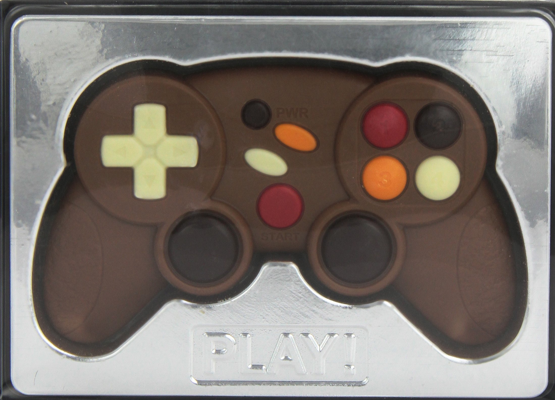 A novelty gamer chocolate game controller, in a present box. This controller has a mix of chocolate colours to resemble the different buttons. An excellent gift for all gamers and