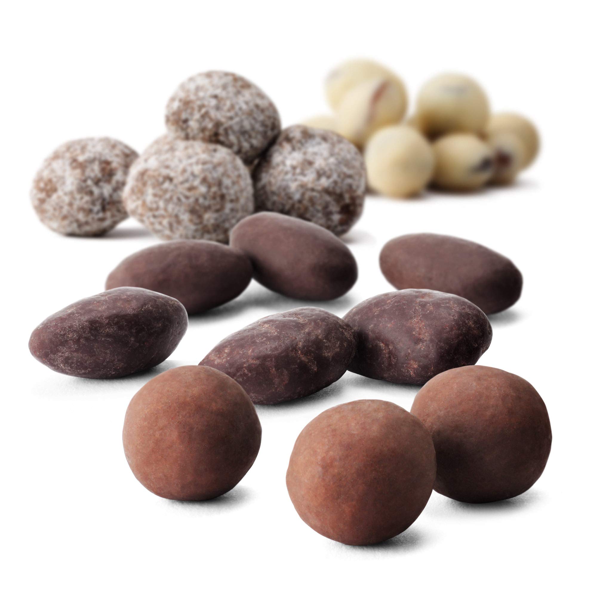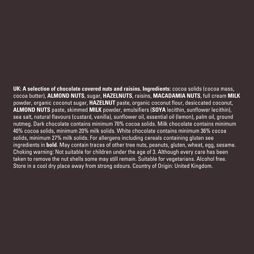 Contents: Almonds, 50% milk, lemon and sea salt Piedmont hazelnuts, Gianduja praline, forty% milk Aegean raisins, Top-cocoa white, nutmeg and almond Almonds panned in sixty five% Supermilk vegan* coconut Macadamias panned in 70% darkish with coconut