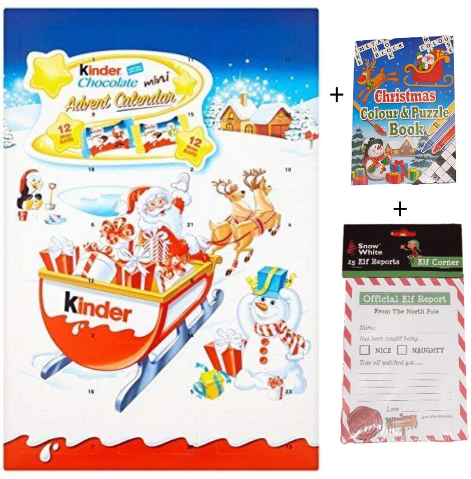 Kinder Chocolate Advent Calendar 135g Gift Set with Children’s Colour & Puzzle Activity Book and 25 Elf Reports