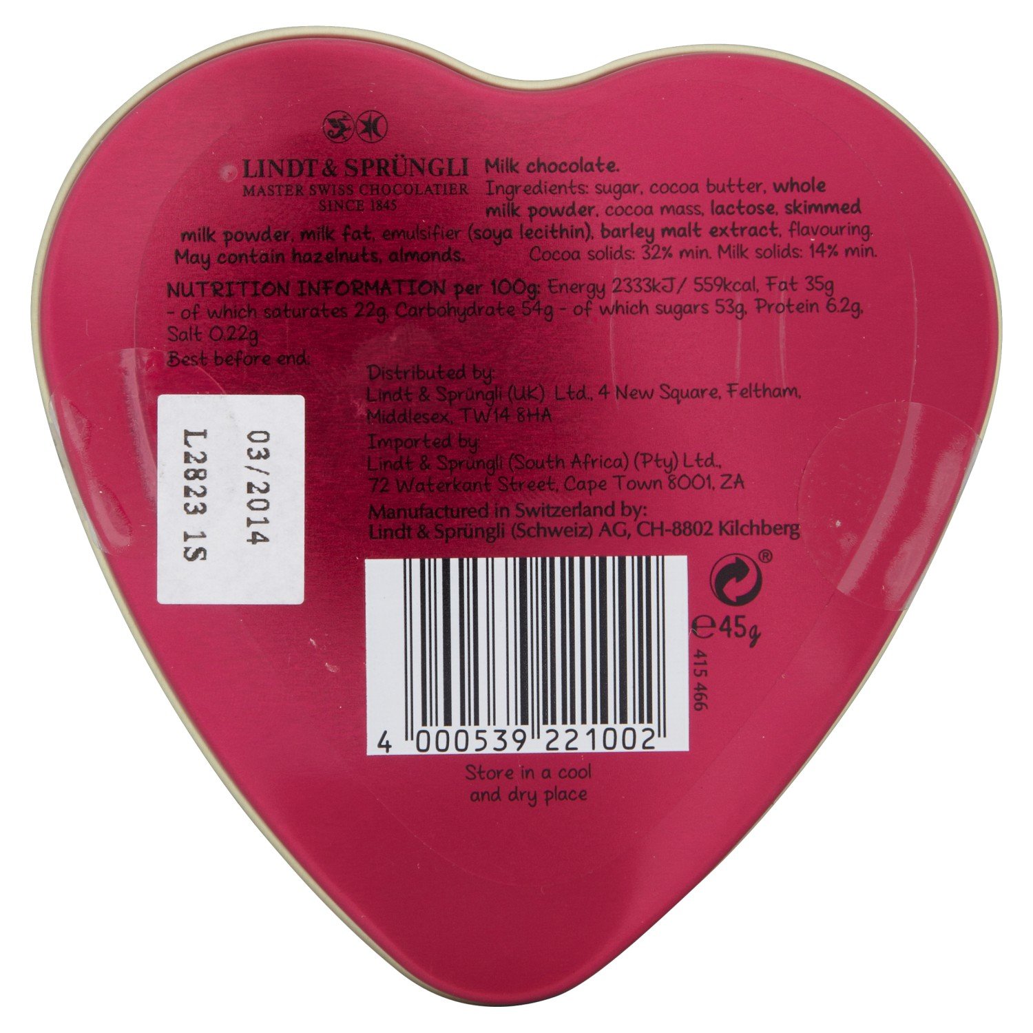 Since 1845 Lindt has been dedicated to producing the sector’s chocolates. Master Chocolatiers have been driven by their passion for skilfully creating delicate masterpieces to indulge all chocolate lover. The Lindt hello only for you heart chocolate tin is the fitting chocolate gift for that somebody special or perhaps a ideal little treat for theself. Nice to sweet you. It is a tiny tin of chocolate hearts, only for you and the stomach. Ingredients Sugar, cocoa butter, whole milk powder, cocoa mass, lactose, skim milk powder, milk fat, emulsifier (soya lecithin), malt extract (barley), flavouring. Would possibly contain traces of hazelnuts and almonds. Milk chocolate incorporates cocoa solids 30% minimum Milk solids 14% minimum