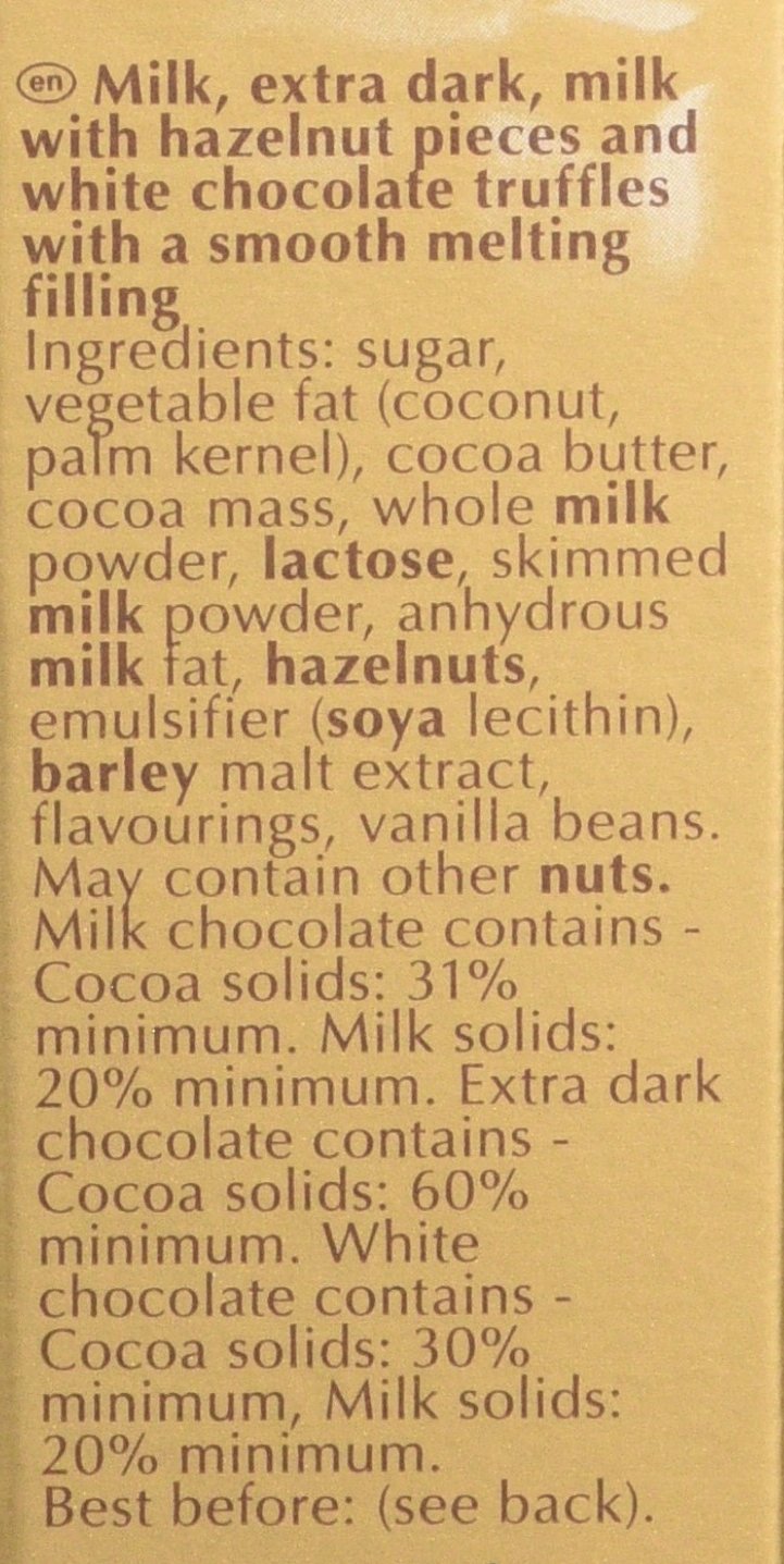 | FlavorName | Assorted chocolates, Coconut Truffles, Dark Chocolate, Hazelnut, Milk Chocolate, Milk Orange, New: Mint Chocolate, Strawberry and Cream, White Chocolate |