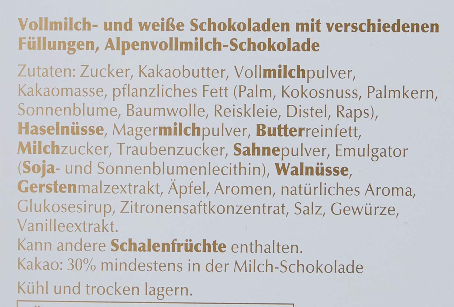 Foods: Zucker, pflanzliches Fett (Kokosnuss, Palmkern), Kakaobutter, Kakaomasse, Vollmilchpulver, Magermilchpulver, Milchzucker, Butterreinfett, Haselnüsse, Emulgator (Sojalecithin),Gerstenmalzextrakt, Aromen, Vanille. Kann Mandeln enthalten.