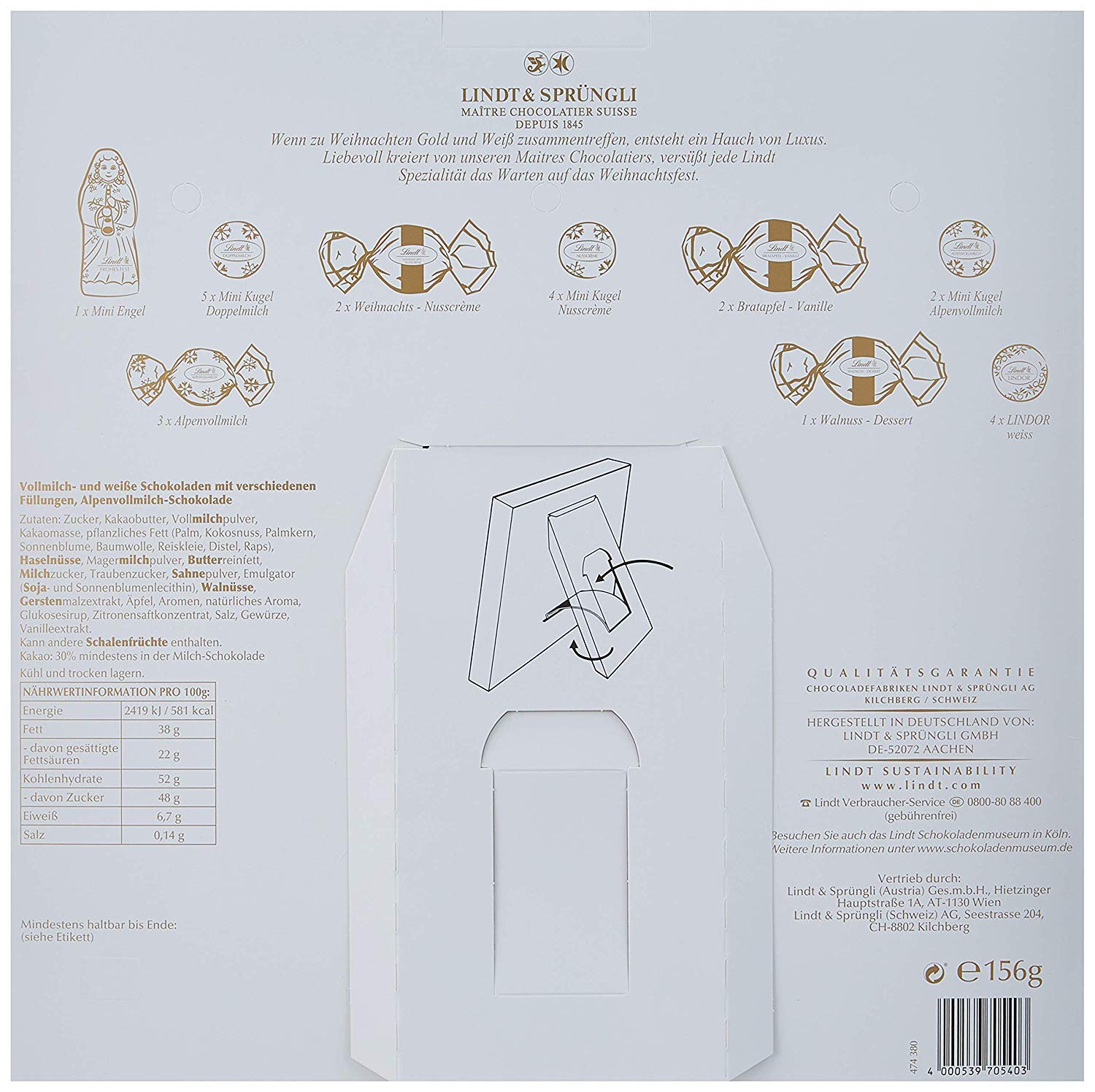Content material: Mini Santa, Lindor (Milk Chocolate, Darkish Chocolate, 60% Cacao, White Chocolate, Haselnut), Lindor Mini Balls, Nutcreme balls